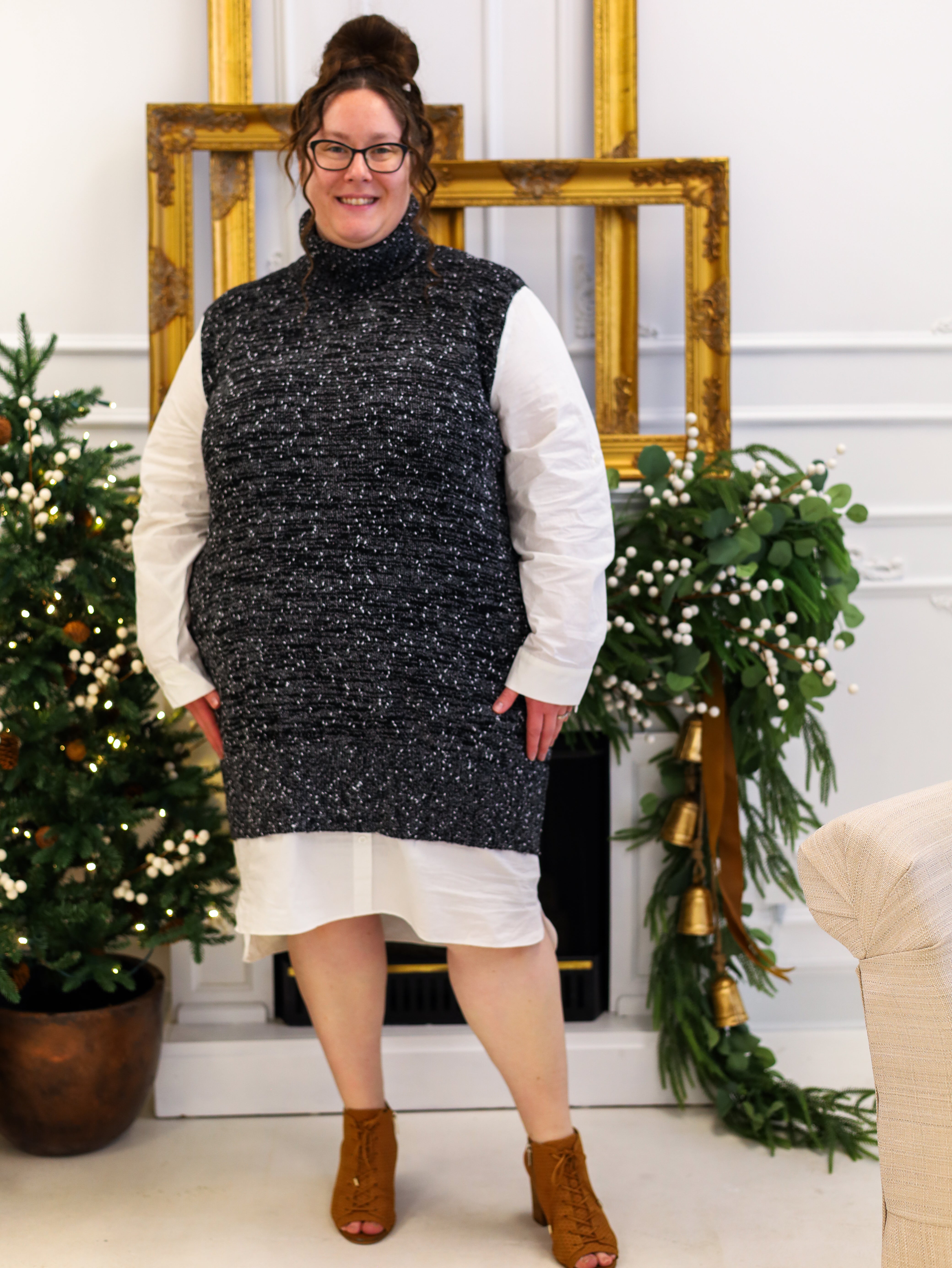 Wrap yourself in cozy elegance with this charming turtleneck sweater dress! Featuring a rich charcoal base with contrasting ivory shirt sleeves, this midi-length stunner brings unexpected flair to your winter wardrobe. Practical hidden pockets keep your essentials close while you stay warm and stylish. Perfect for layering over tights or pairing with boots, this playful piece transitions effortlessly from casual coffee dates to weekend adventures.