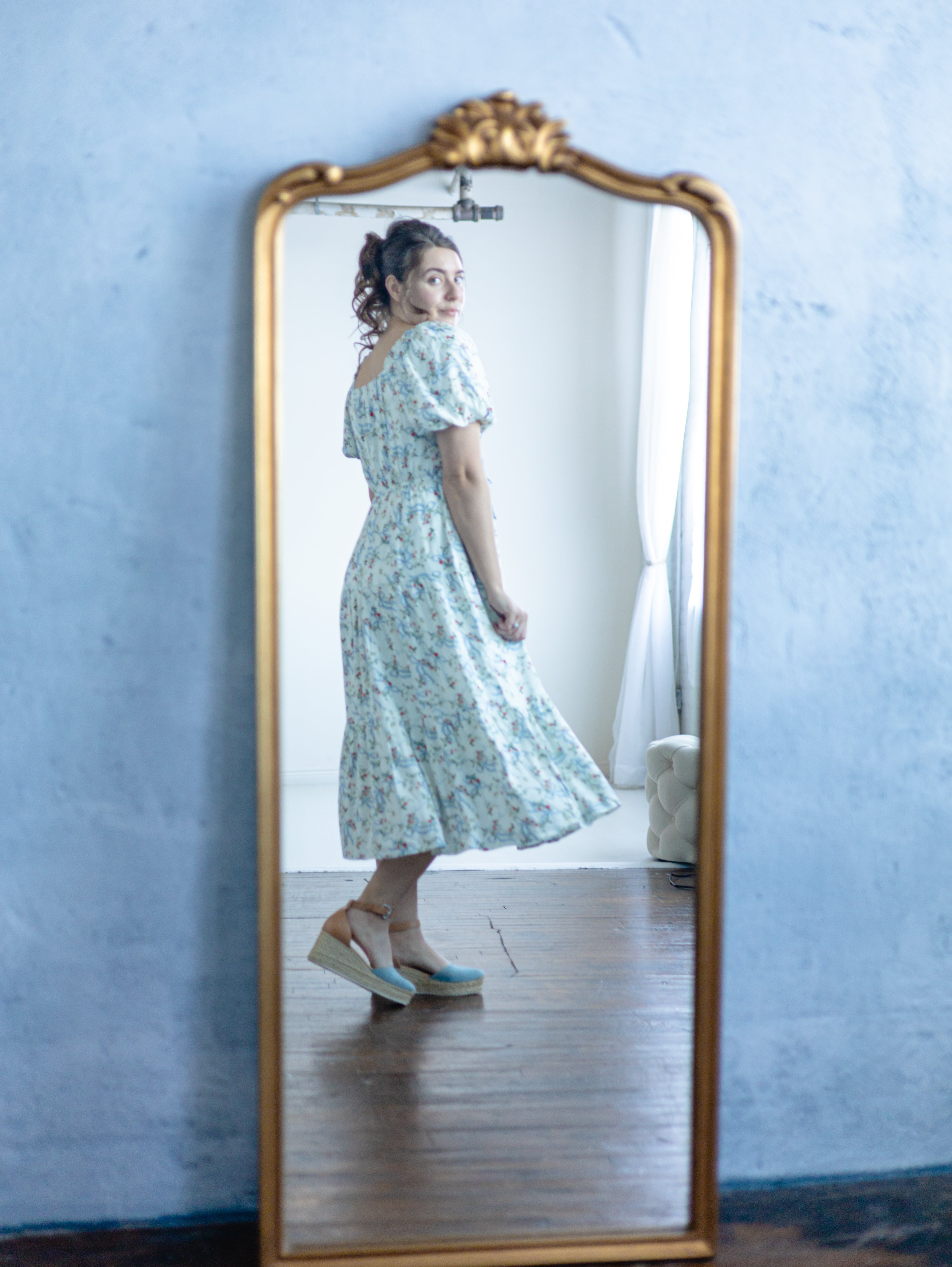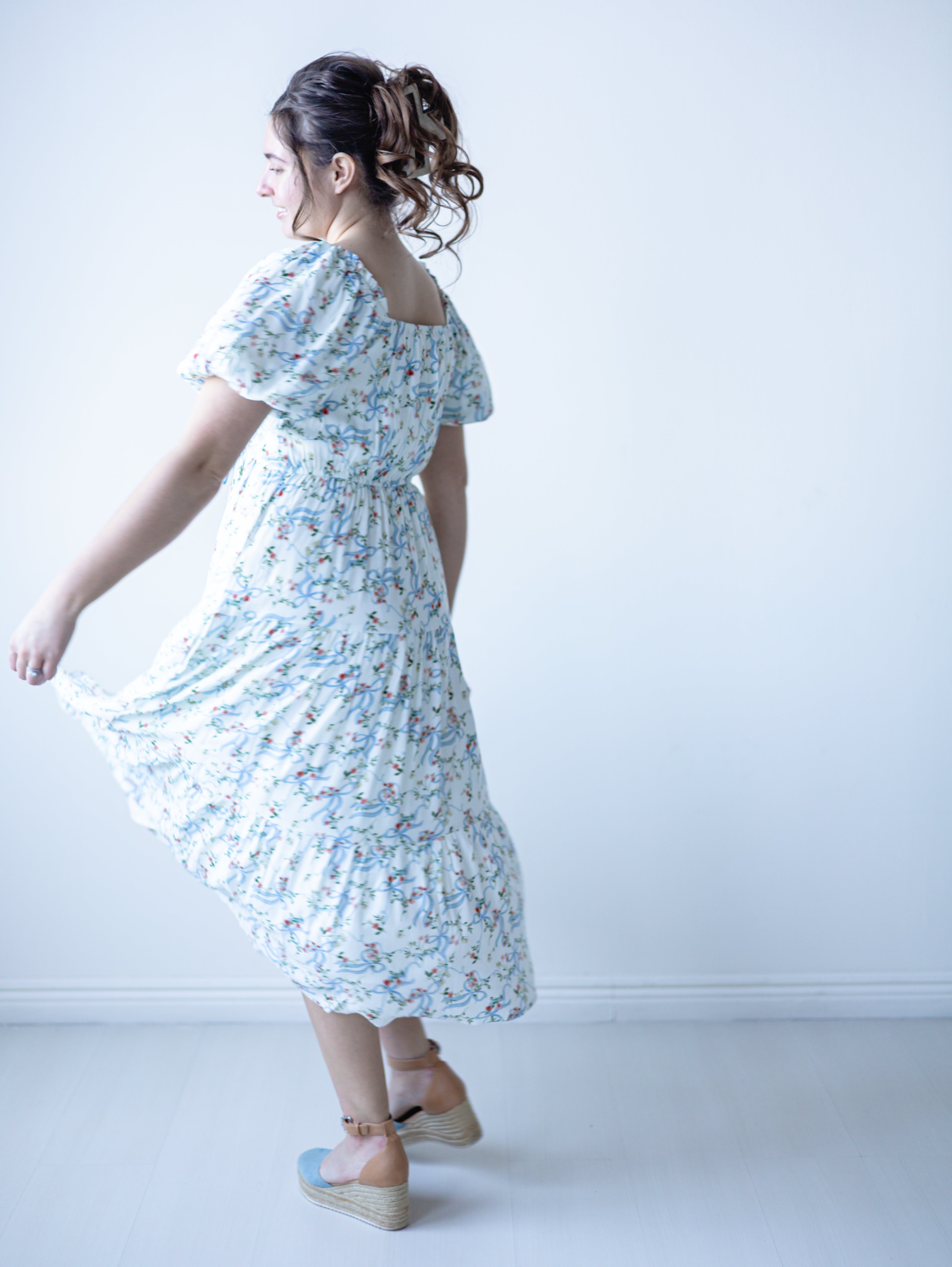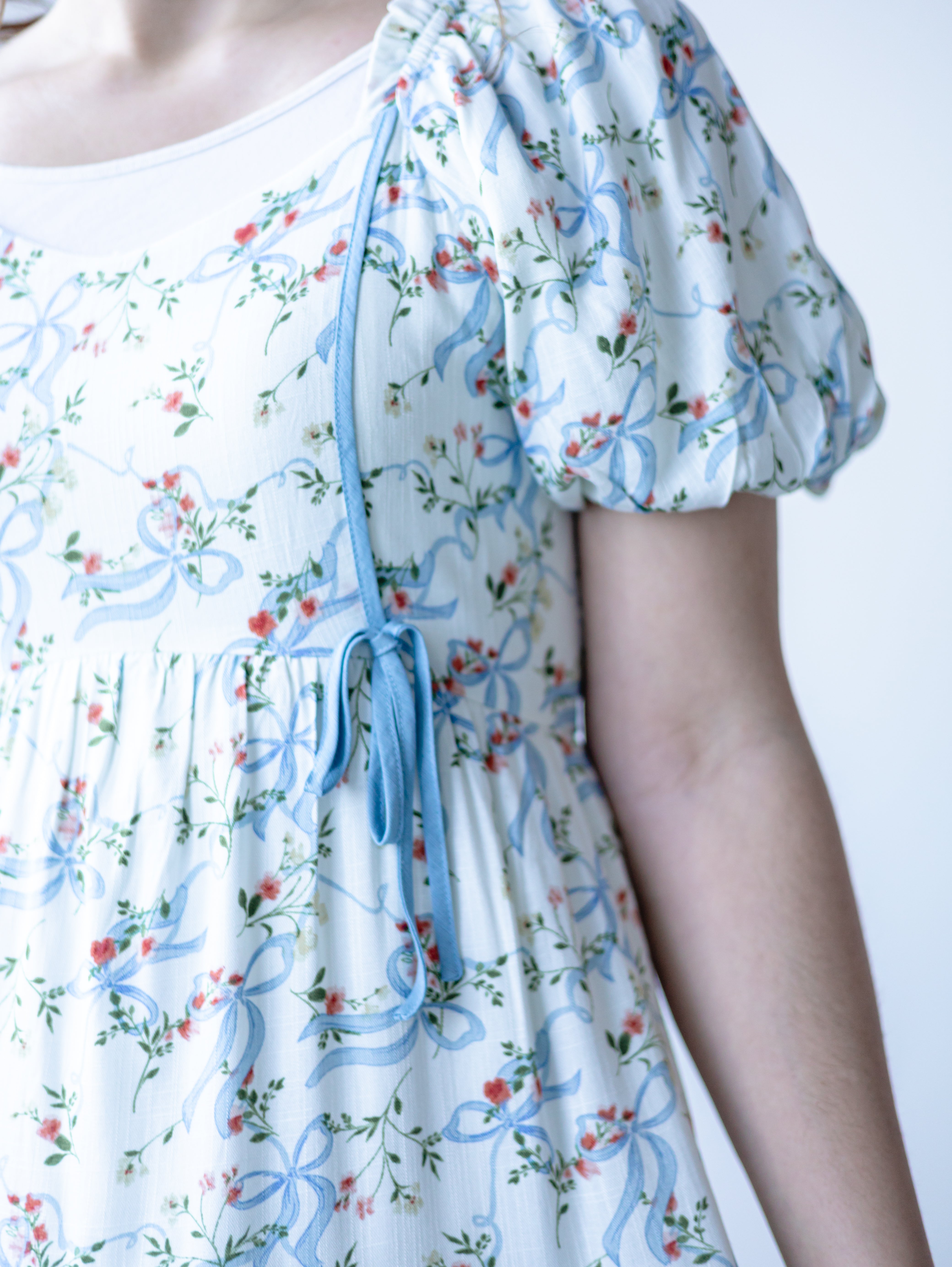 Description: Elevate your wardrobe with this charming Blue Bird Bow Dress, featuring a delicate ribbon detail floral print that brings timeless elegance to any occasion. The flattering scoop neckline and romantic puff sleeves create a feminine silhouette perfect for brunch, garden parties, or casual outings. Crafted with quality ribbon-adorned floral fabric, this dress combines vintage-inspired style with modern comfort. A versatile piece that transitions seamlessly from day to night.