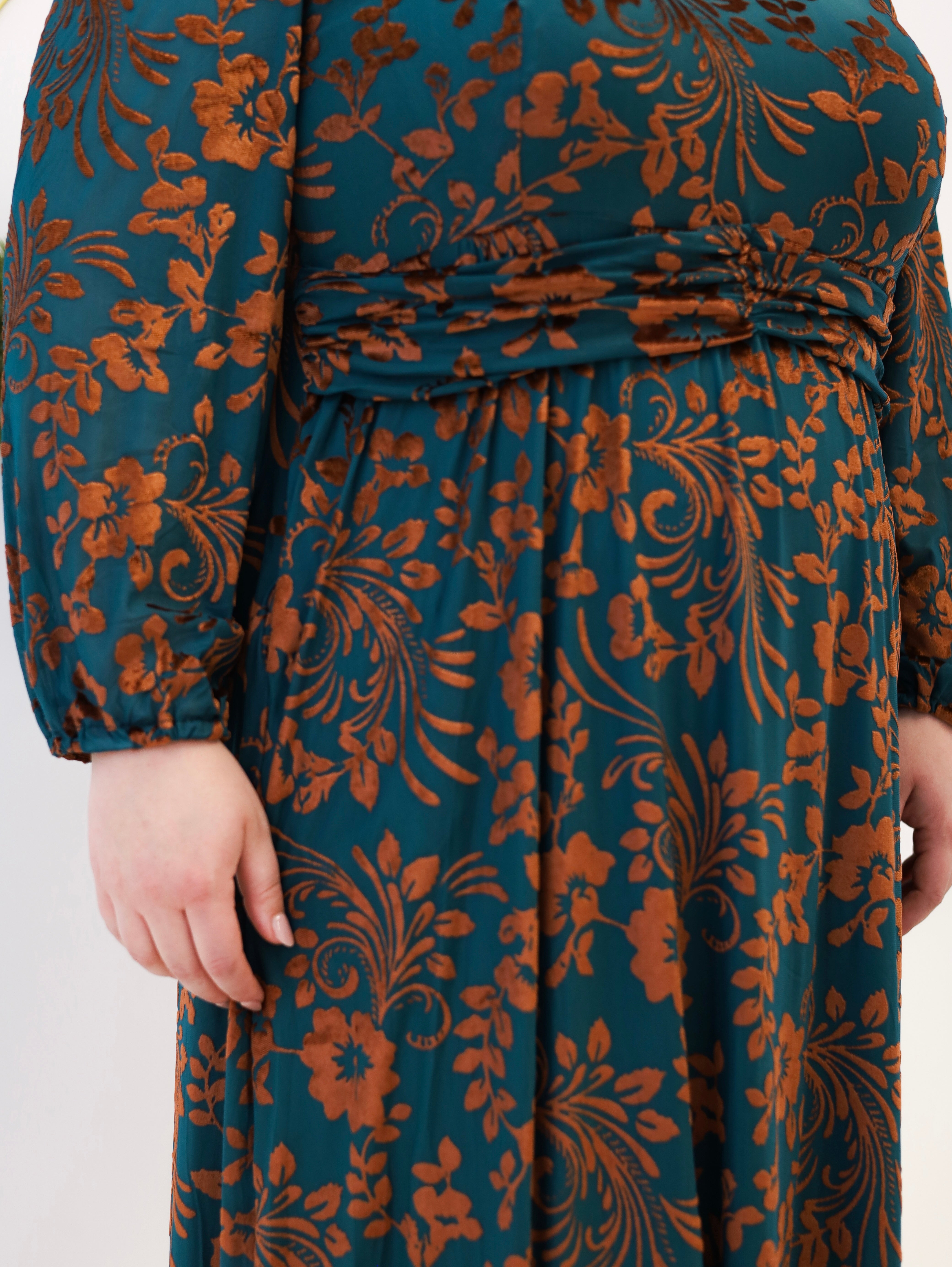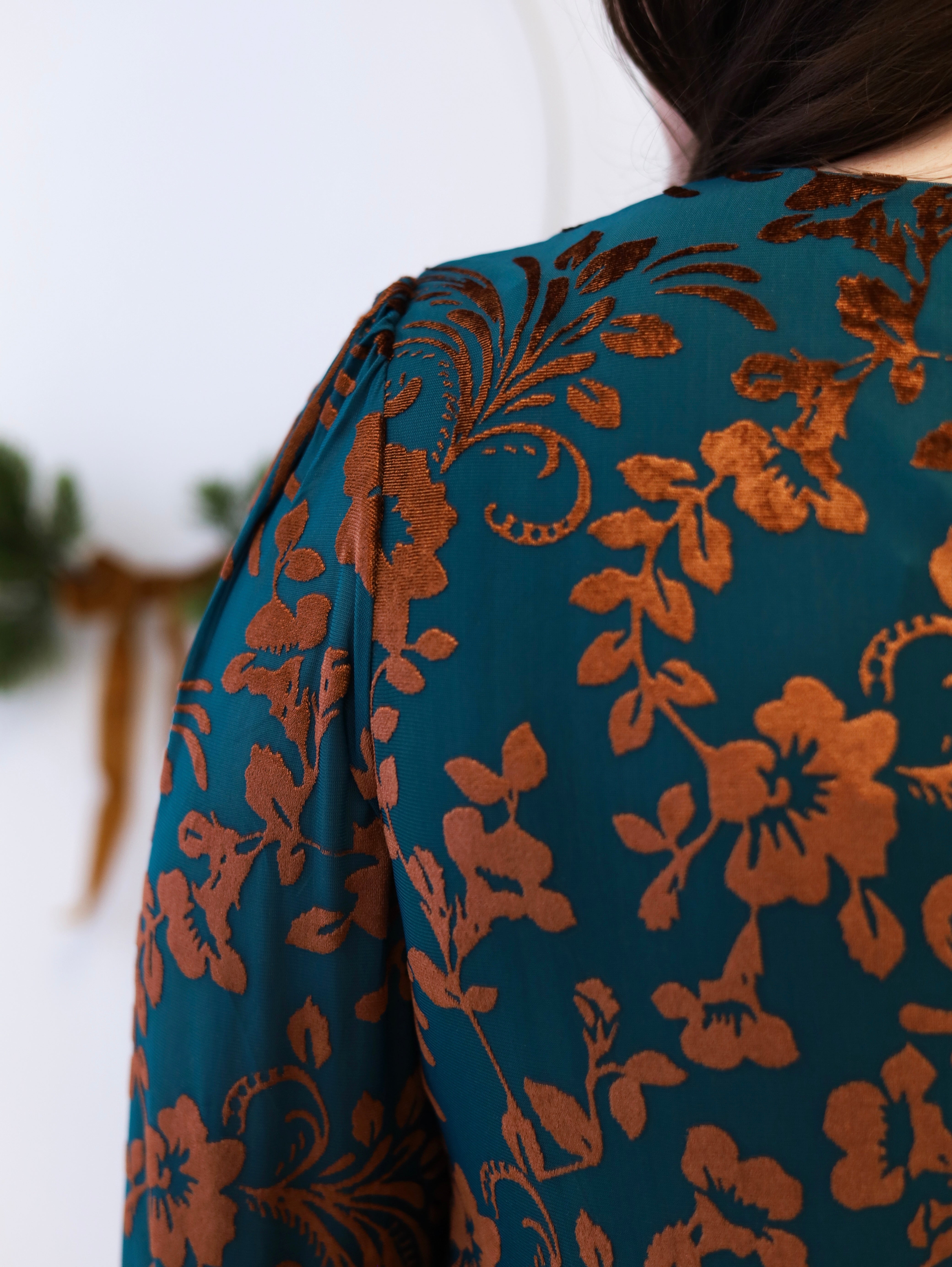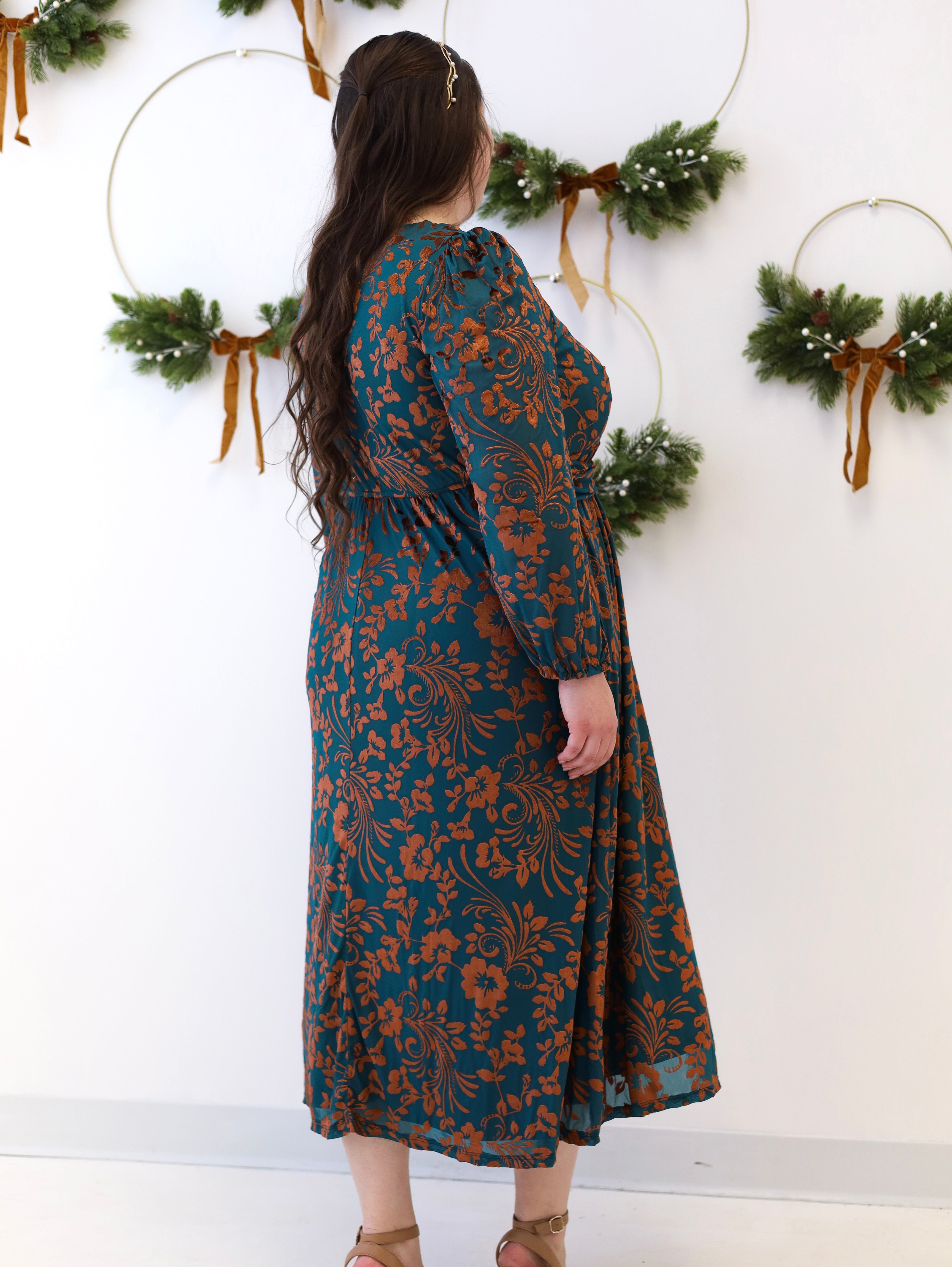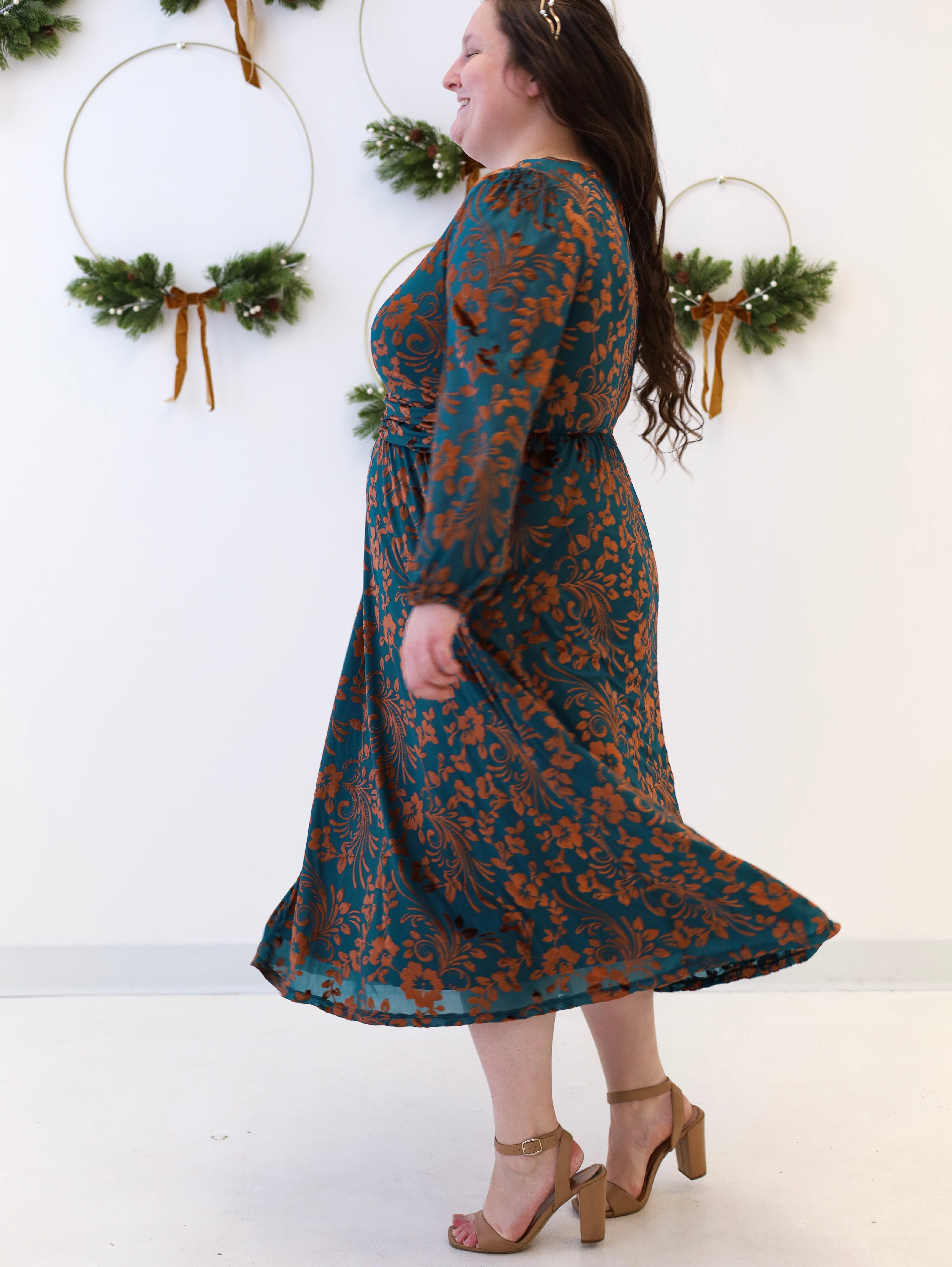 Jingle all the way in this stunning Christmas Bells Gold and Teal Velvet Dress! Crafted from luxurious floral burnout velvet, this festive number features an elegant sash detail that cinches your waist beautifully. The elastic waist ensures all-day comfort while the lined interior keeps you feeling polished and put-together. Perfect for holiday parties, seasonal celebrations, or whenever you want to add a touch of sparkle and whimsy to your wardrobe. Dress it up with heels or keep it casual—either way, you'll be turning heads!