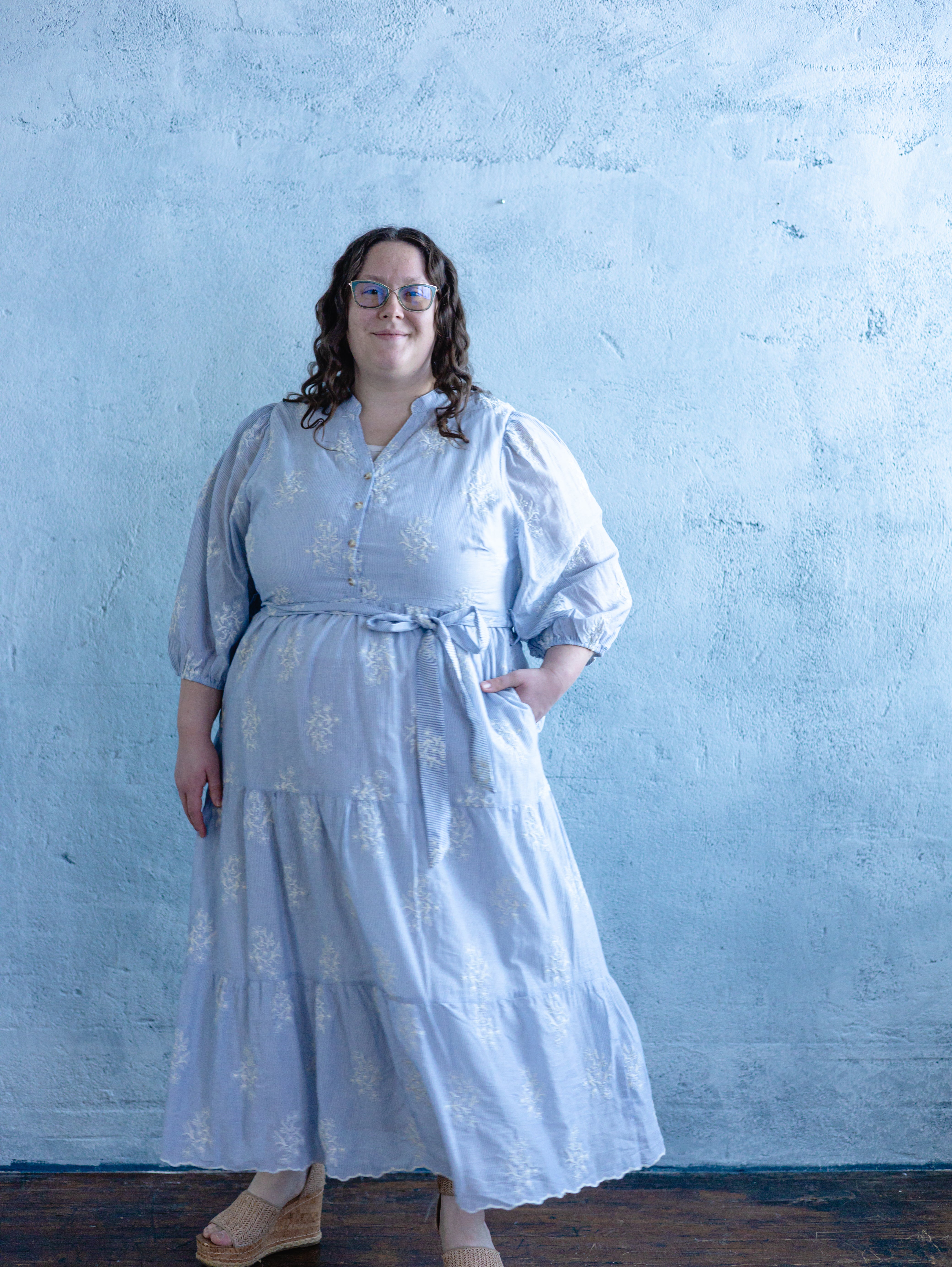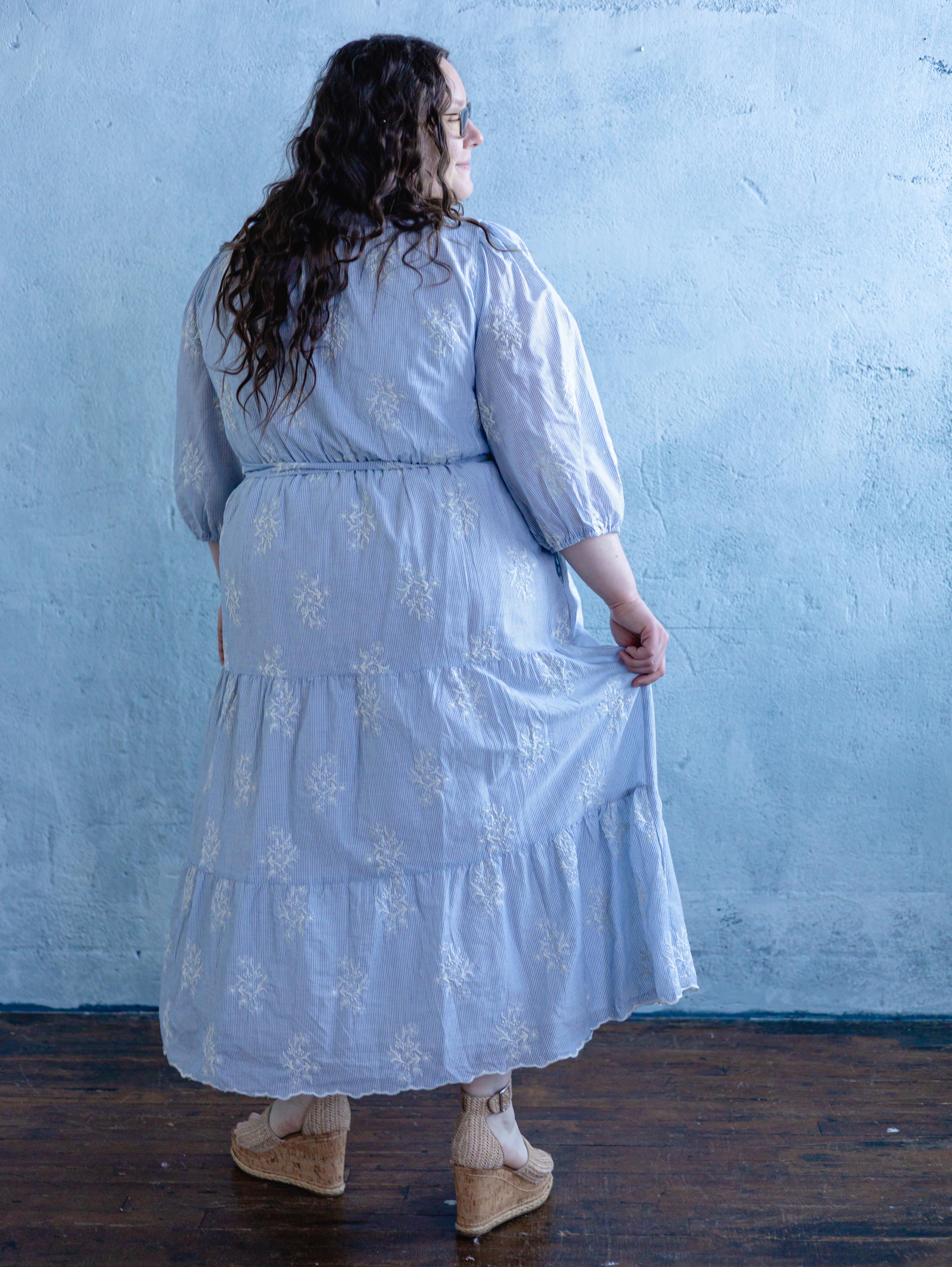 Description: Elevate your cottagecore aesthetic with this stunning plus-size pinstripe maxi dress. Featuring delicate floral embroidery and a feminine scalloped hemline, this dress boasts a flattering V-neckline, adjustable waist tie, and voluminous 3/4 balloon sleeves. The tiered skirt creates a graceful, flowing silhouette for any spring occasion.