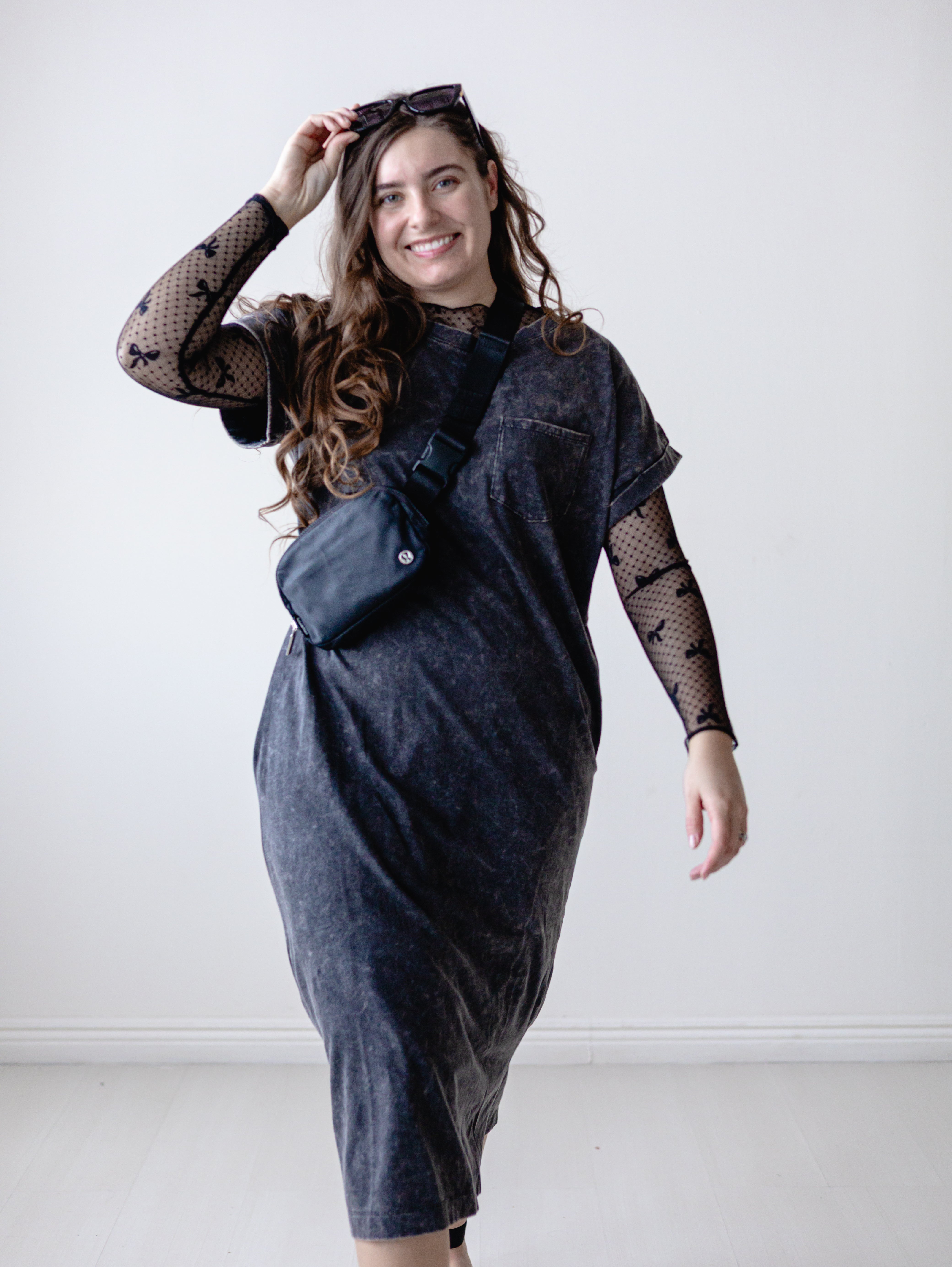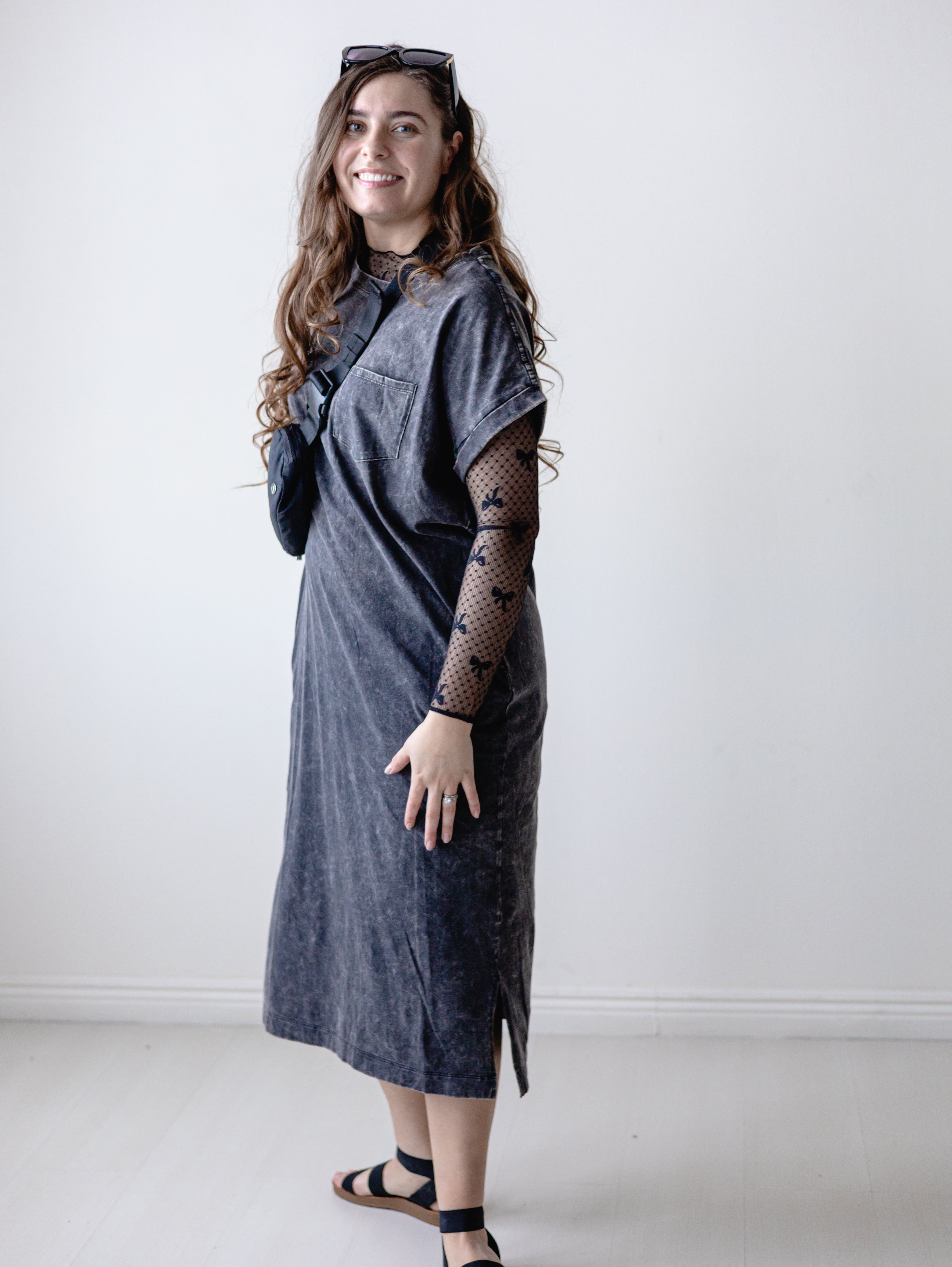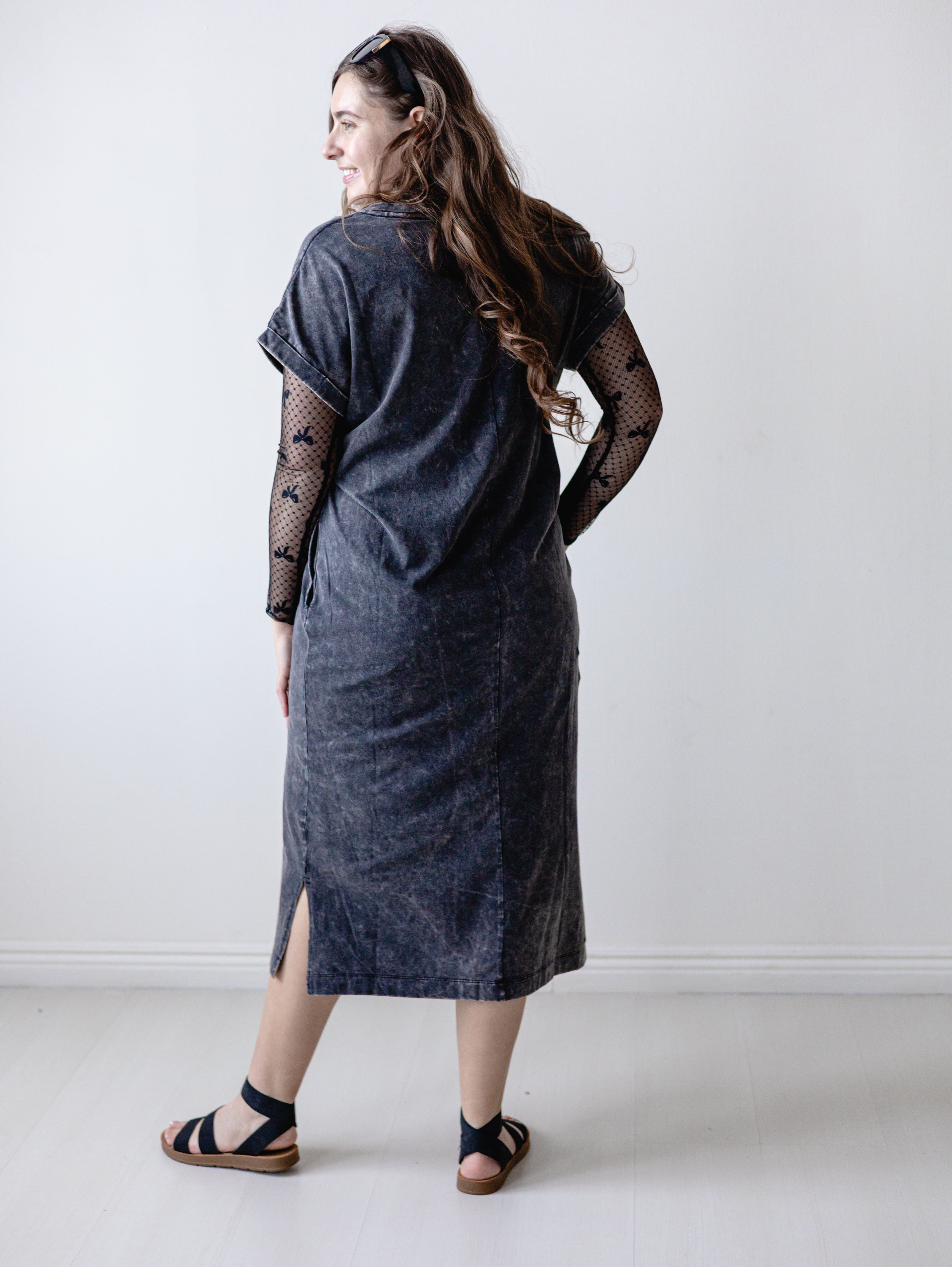 Description: The Black Acid Wash Short Sleeve T-Shirt Dress Effortlessly cool and undeniably comfortable, this washed t-shirt dress features exposed seams for an edgy, contemporary look. The relaxed silhouette works perfectly as a standalone piece or layered over your favorite basics. Crafted from soft cotton blend fabric, it's ideal for casual outings, weekend hangouts, or laid-back days at home. The acid wash finish adds vintage charm while the short sleeves keep things breezy. A versatile wardrobe essential that transitions seamlessly from day to night.