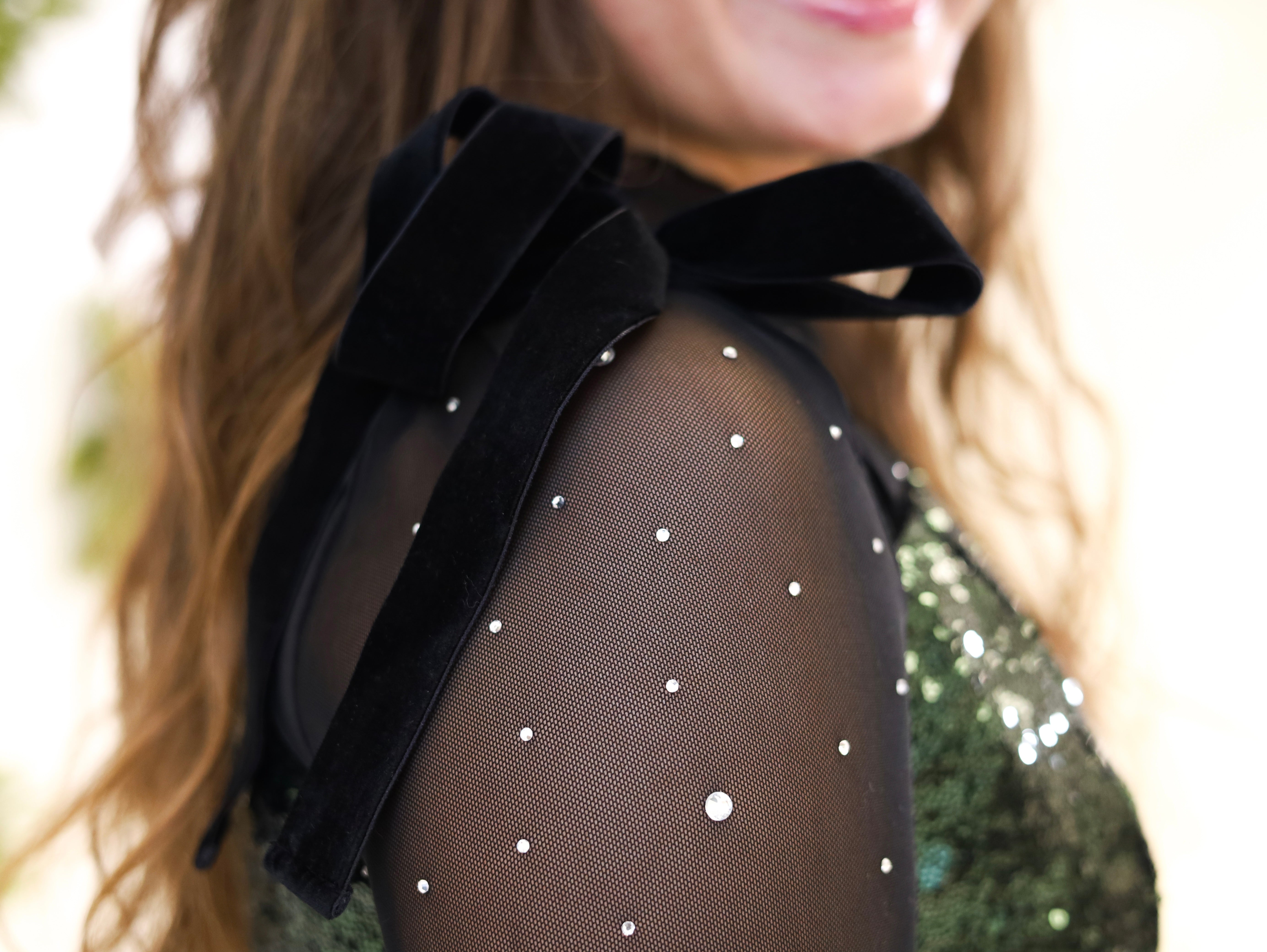 - SEQUIN FABRICATION - FLARED KNEE LENGTH SKIRT - VELVET SELF TIE SHOULDER STRAPS - HIDDEN SIDE ZIPPER - ELASTIC WAISTBAND AT BACK - FULL LINING