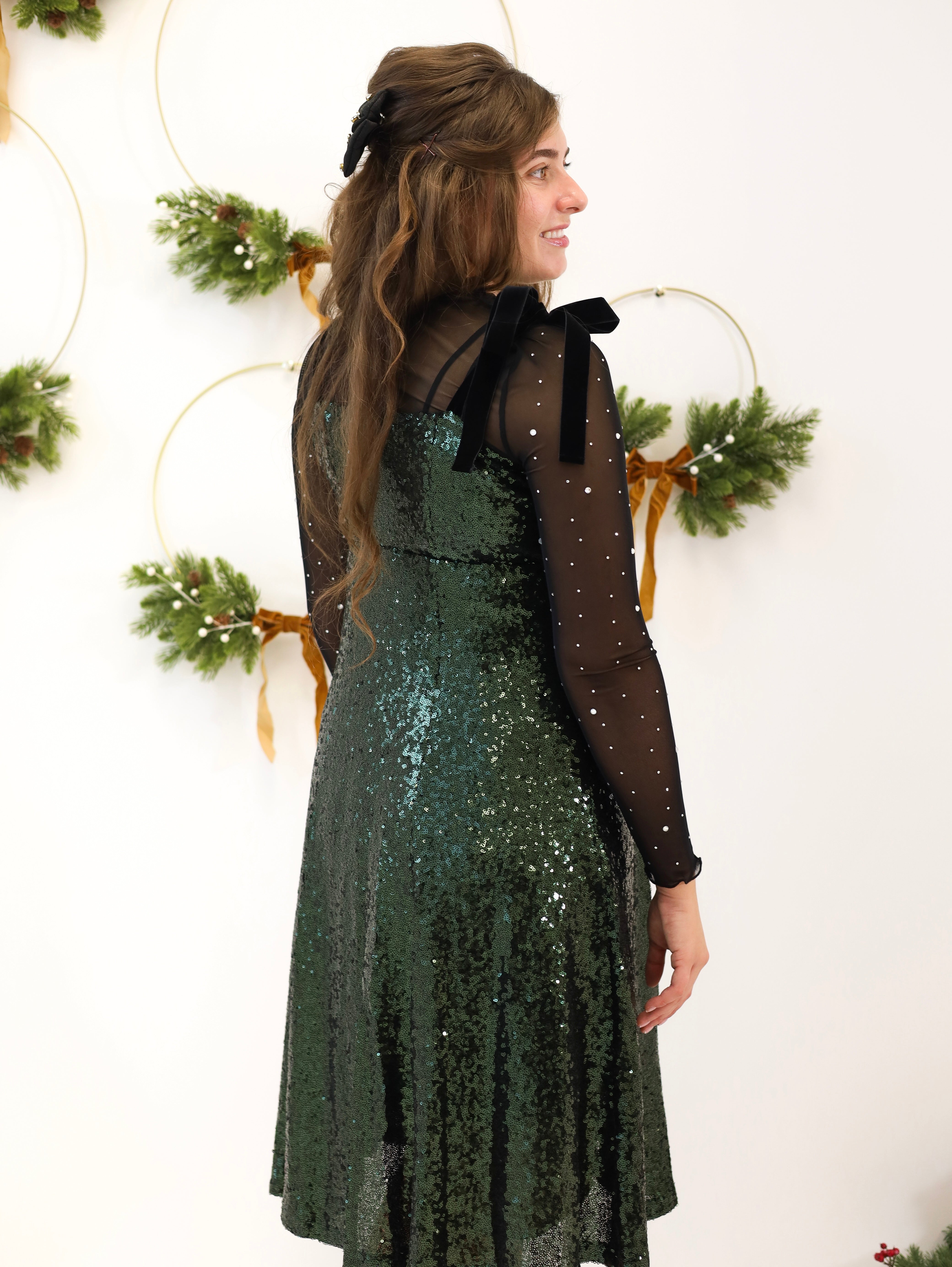 Sparkle through the season in this show-stopping emerald green sequin dress! Designed for holiday magic, it features a flattering flared knee-length skirt that moves with you, velvet self-tie shoulder straps for an elegant touch, and a hidden side zipper for easy wear. The elastic back waistband ensures comfort all night long, while the full lining keeps everything smooth and polished. Whether you're hitting a festive party or ringing in the new year, this dress delivers serious shimmer and style!