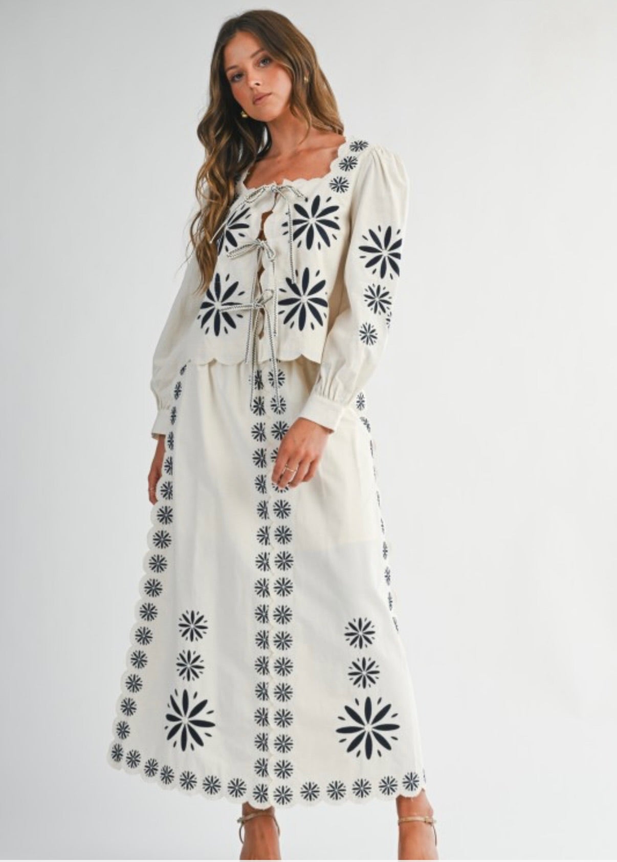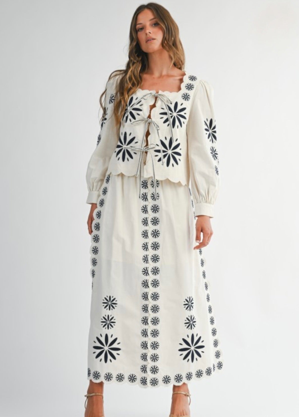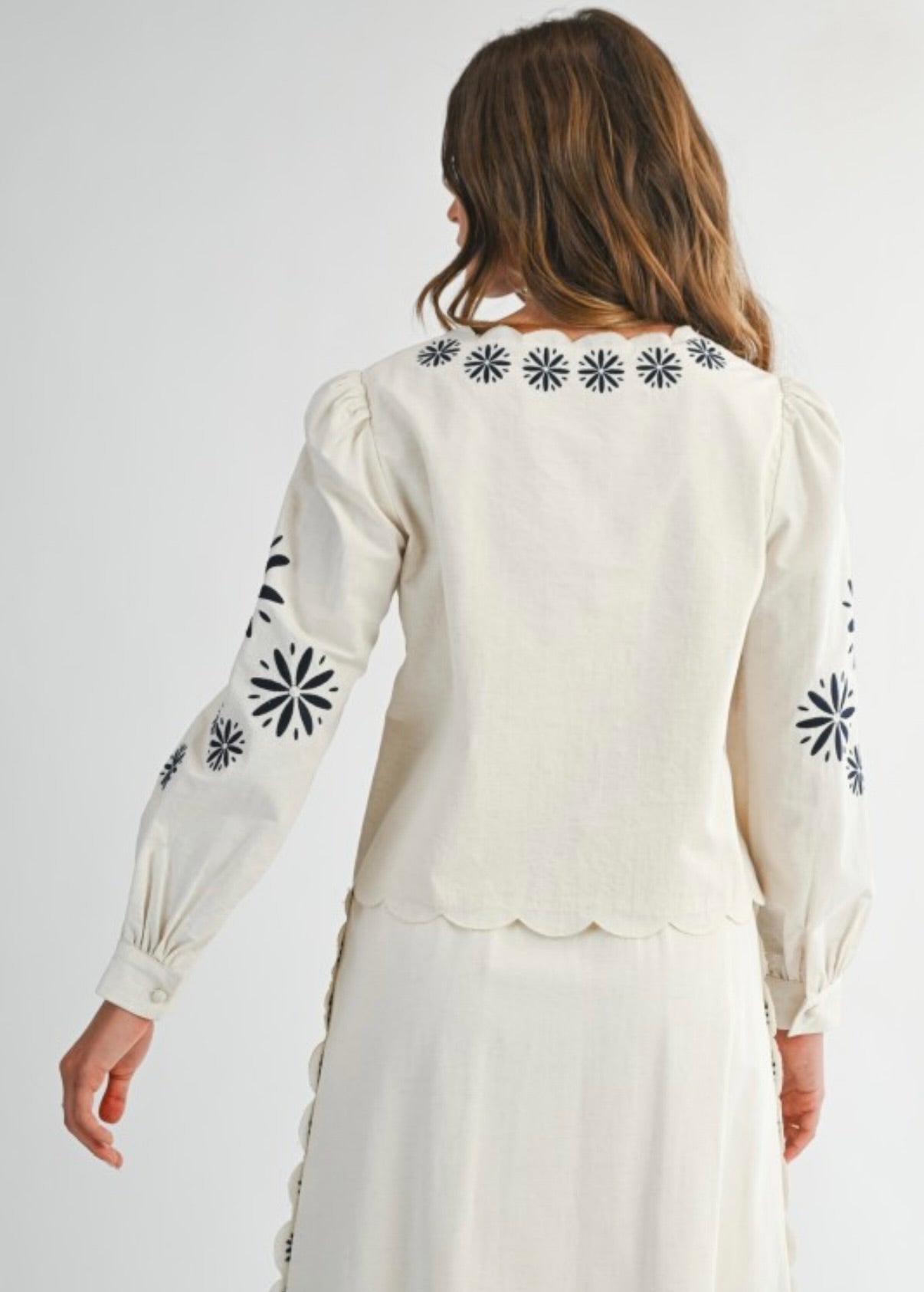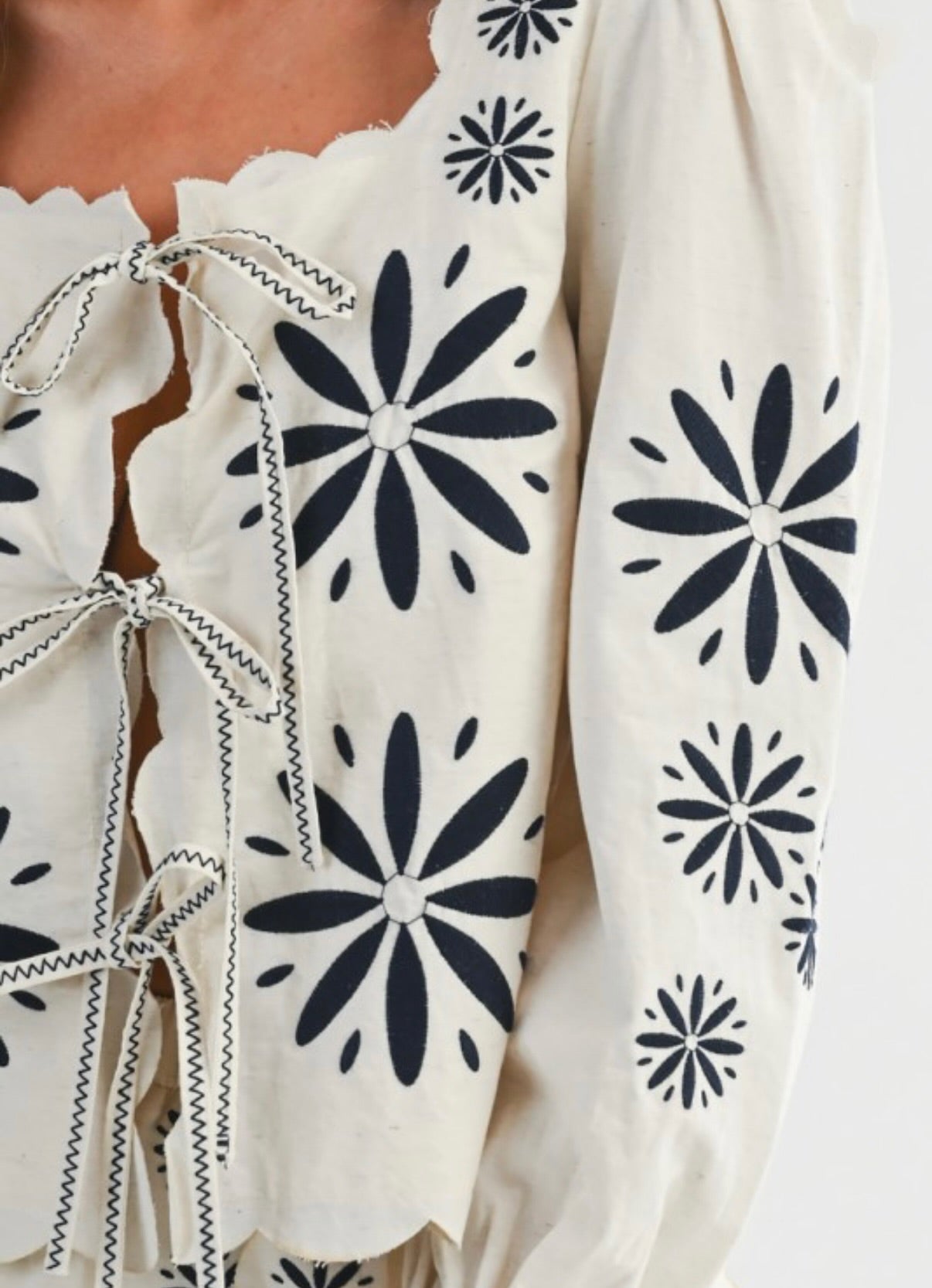 The scalloped hem and adjustable front tie closure bring both elegance and playfulness to the silhouette, while the long puff sleeves and elastic cuffs ensure all-day comfort. This top pairs perfectly with high-waisted skirts, jeans, or its matching embroidered skirt for a coordinated look.