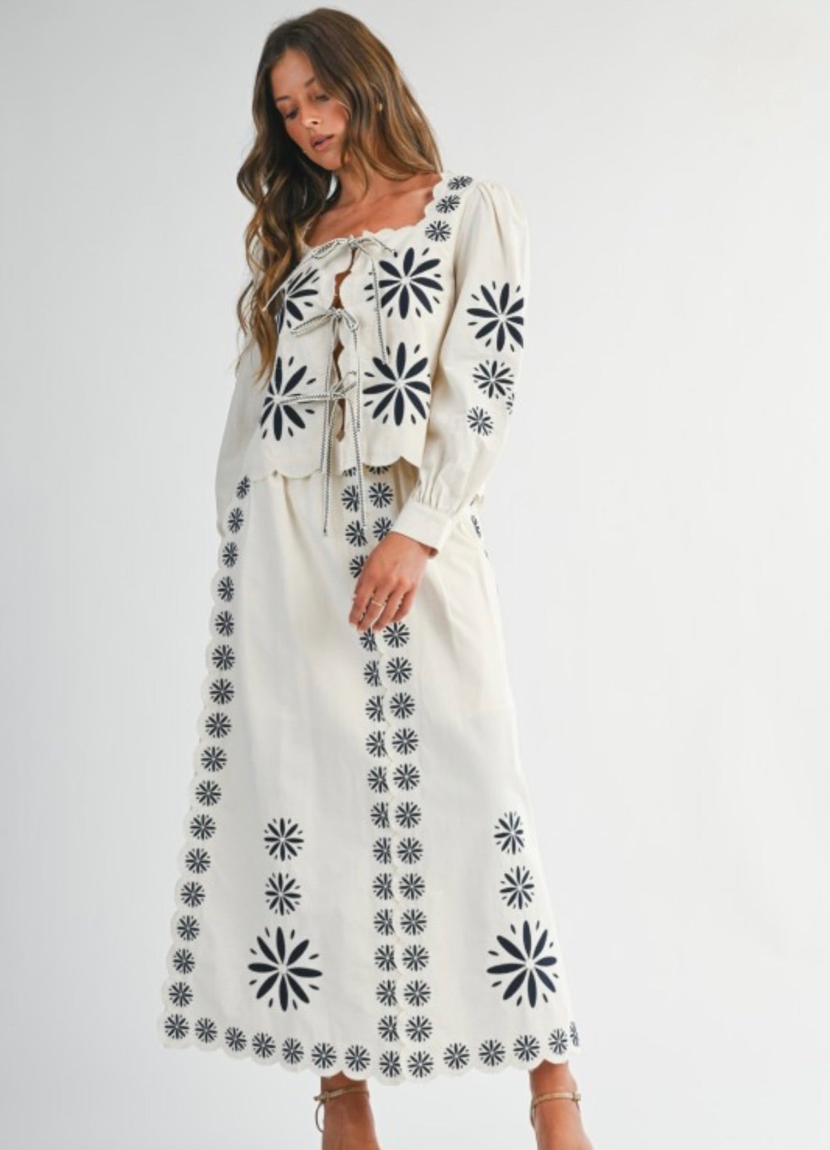 Featuring an elastic waistband for a comfortable and flexible fit, this midi skirt flows gracefully with every step. The floral detailing runs vertically down the front and sides, creating a flattering silhouette. Pair it with its matching embroidered top or keep it casual with a tucked-in tee.