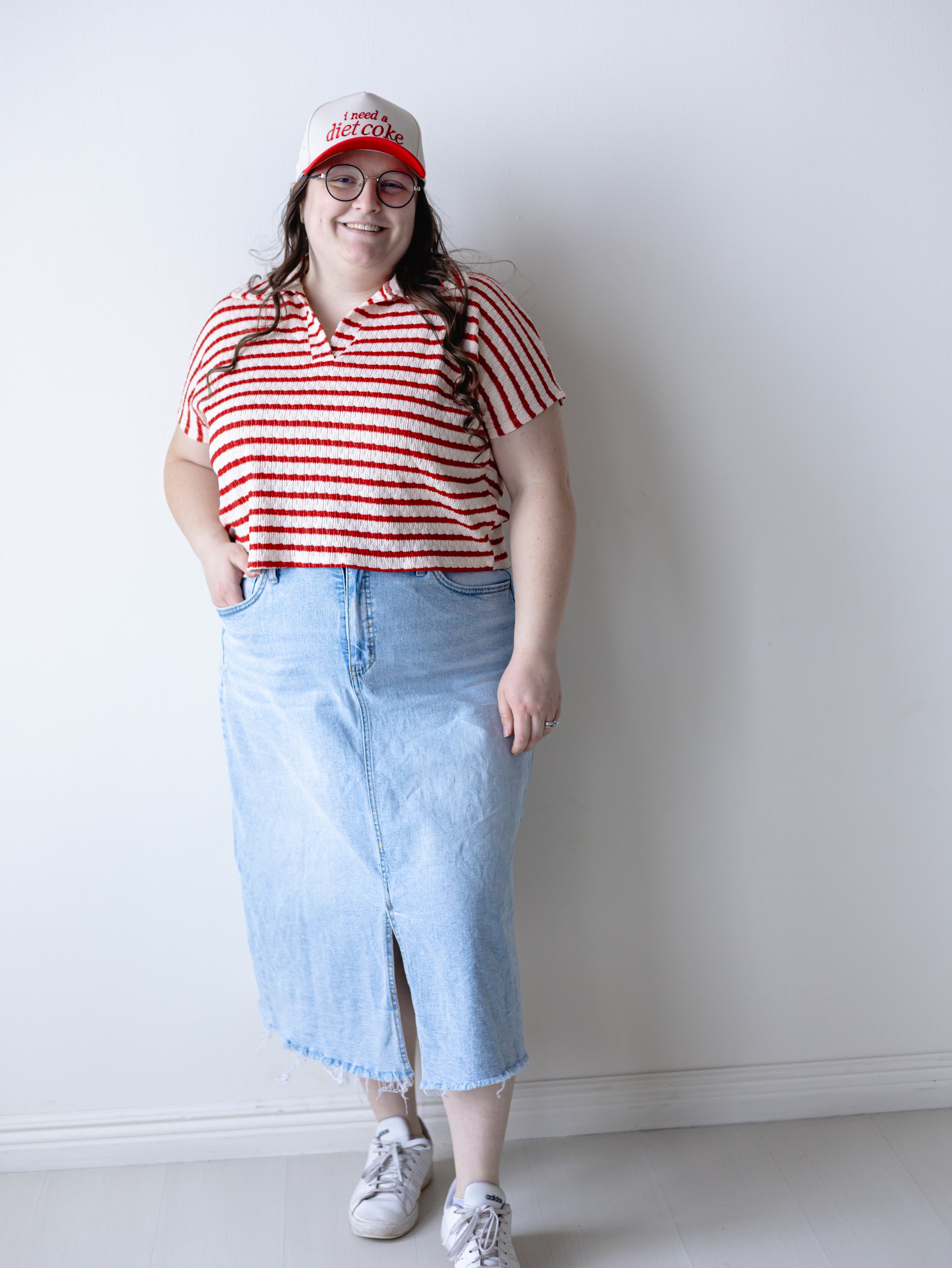 Description: Elevate your casual wardrobe with this striking red and cream striped collared top. The split neckline adds modern sophistication, while the classic stripes deliver timeless appeal. Perfect for layering or wearing solo, this versatile piece transitions seamlessly from weekend outings to relaxed office settings. The structured collar keeps you polished, making it an essential addition to any style-conscious closet.