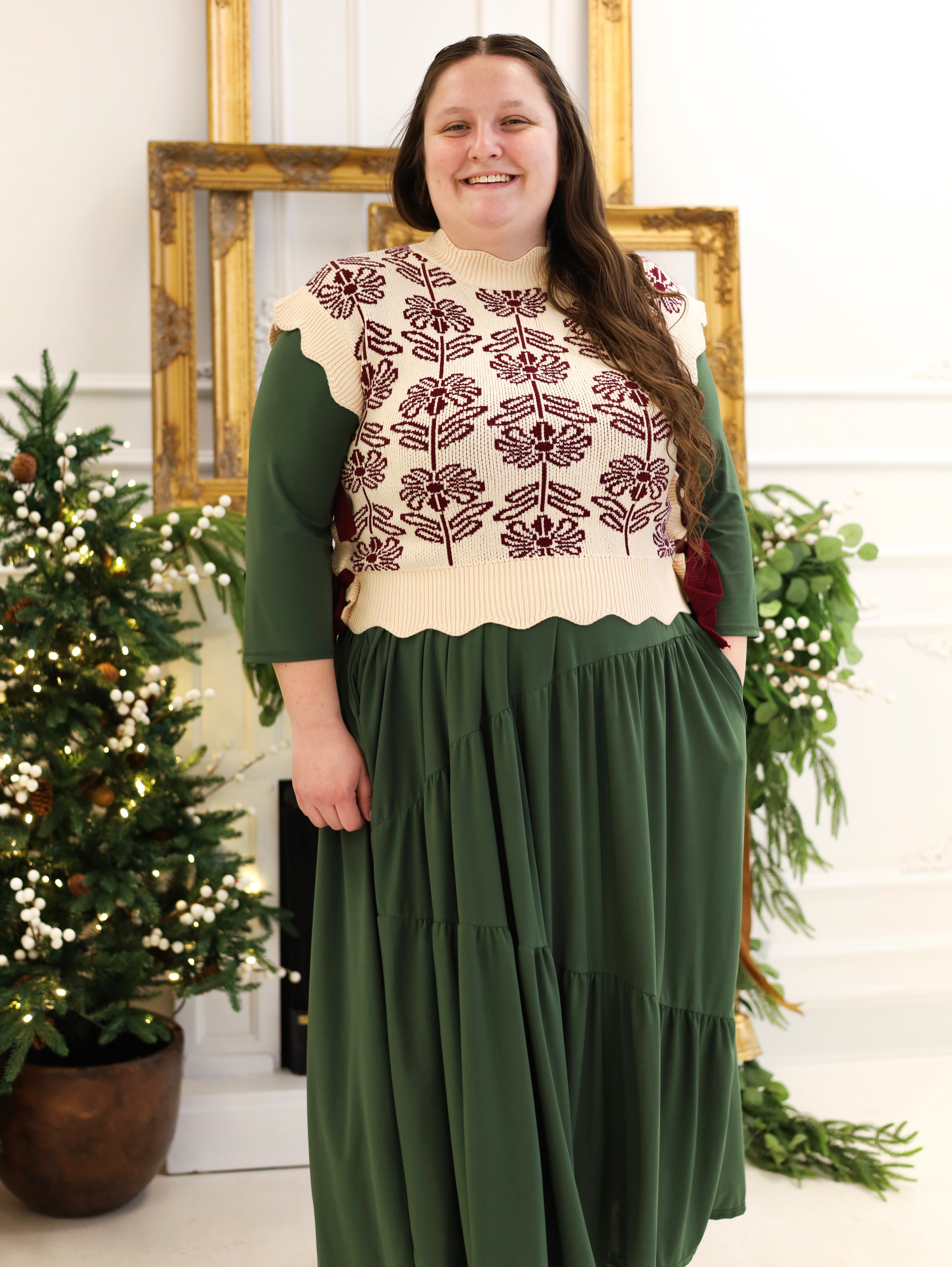 Layer up with effortless charm in this floral sweater vest! Featuring a ribbed scalloped mock neck and matching hem details, it's designed for a polished look. The eye-catching floral knit pattern brings personality to any outfit, while contrast side ties let you cinch the fit to perfection. Pair it over a crisp white tee or cozy long-sleeve for endless styling possibilities. A playful piece that proves sweater vests are anything but boring.