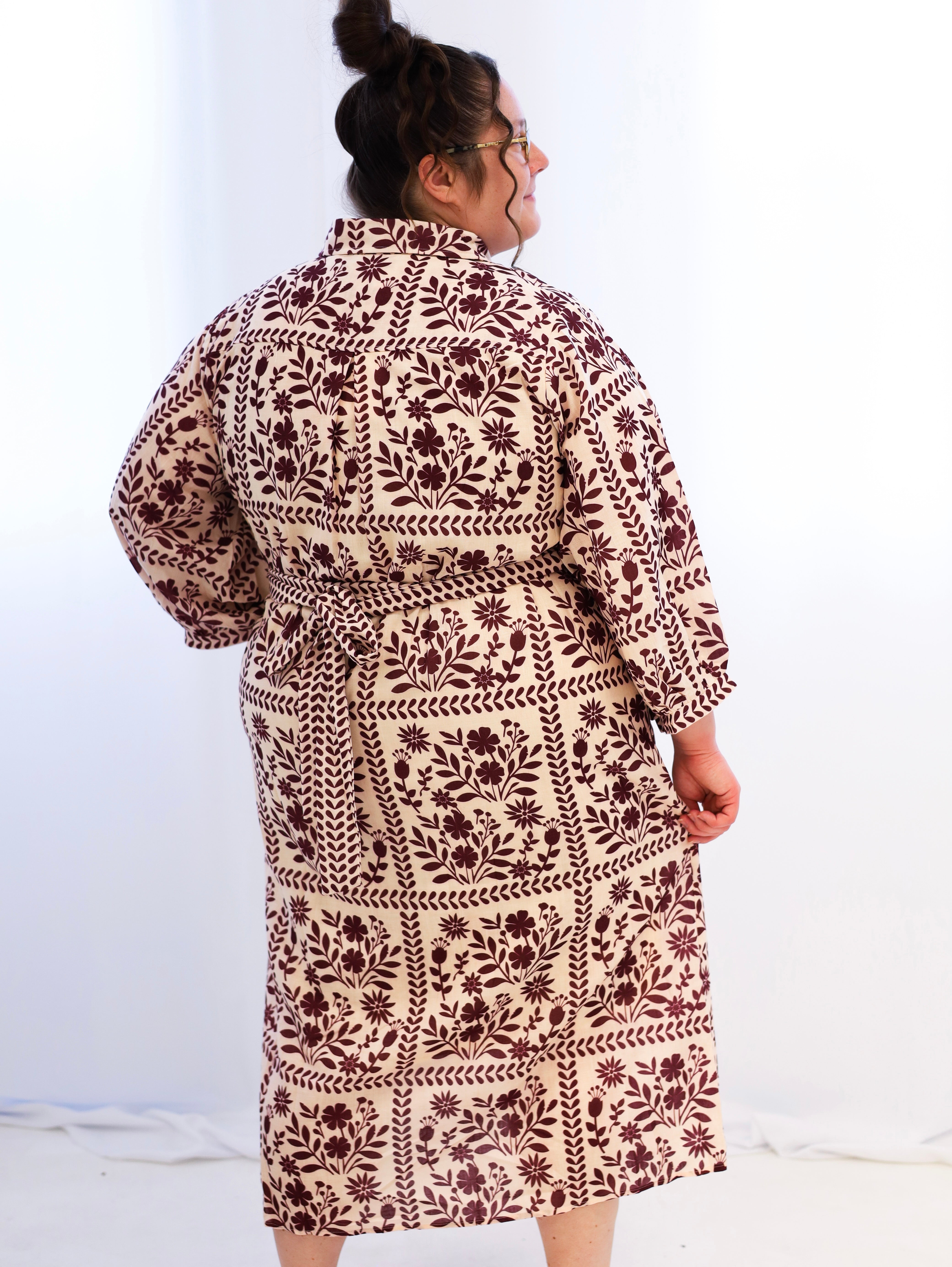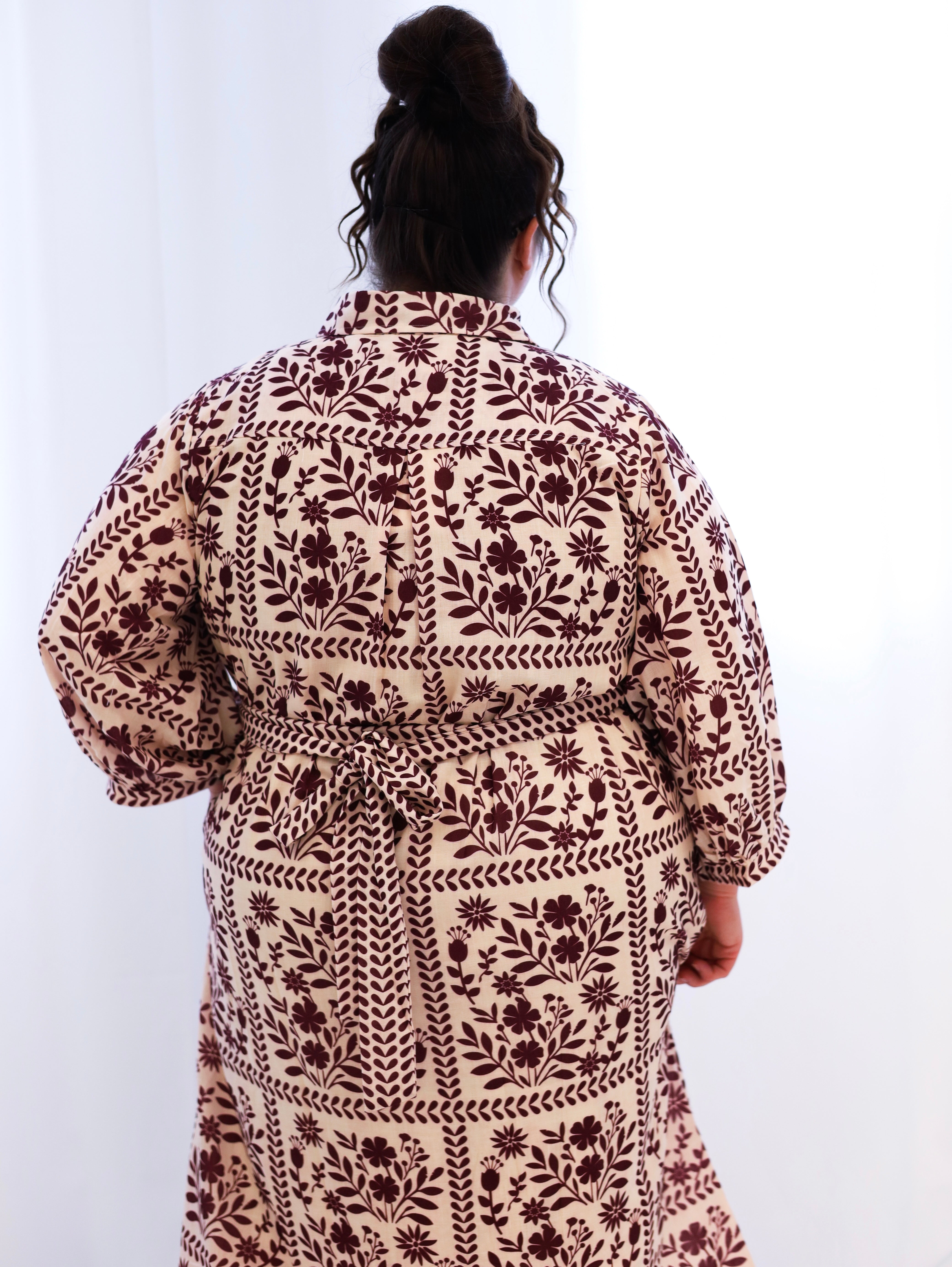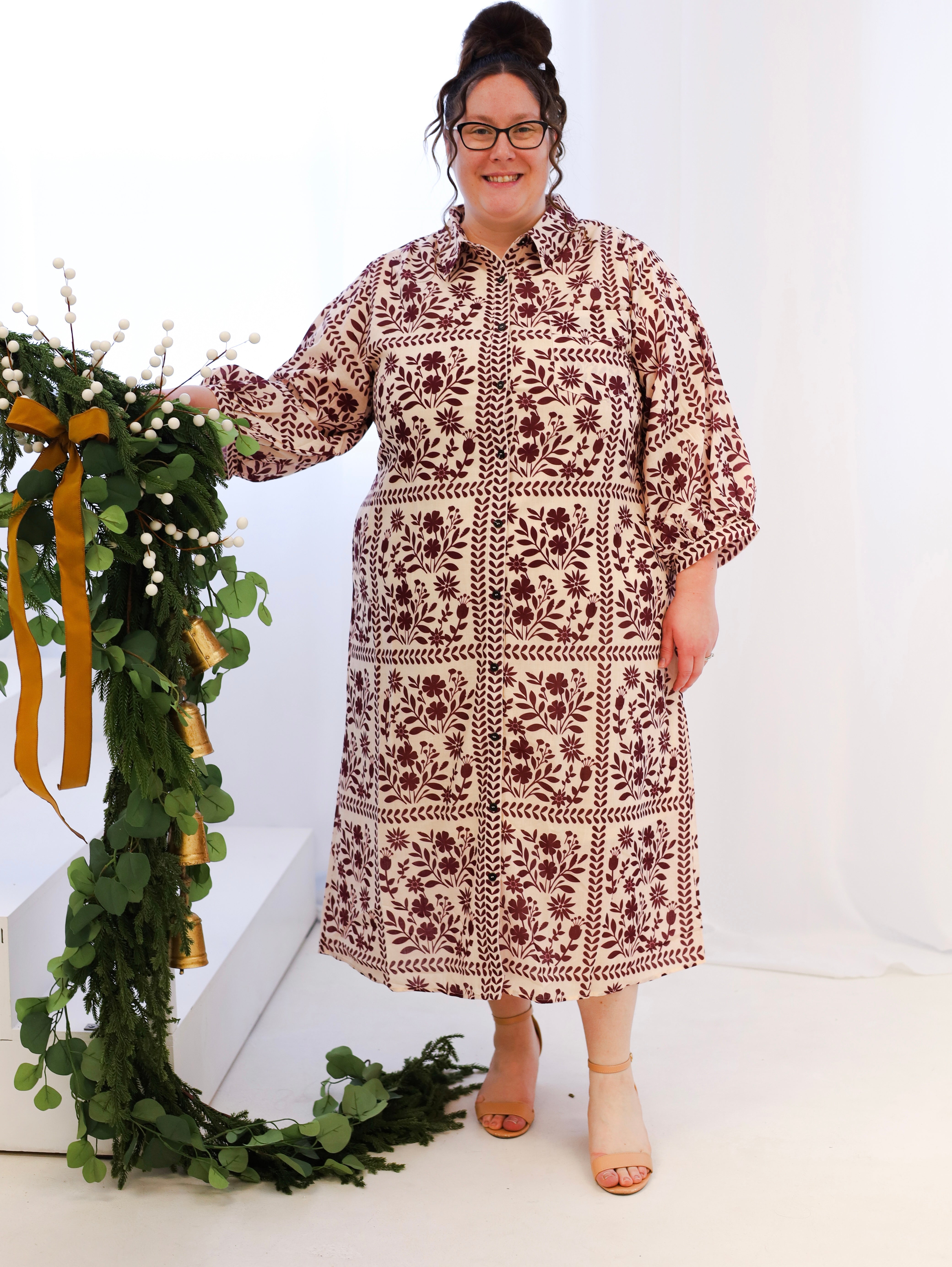 Meet your new go-to dress! This burgundy and cream floral midi features a gorgeous border print that frames the design beautifully. Button down from top to bottom for easy styling, and rock the removable tie belt to create your perfect silhouette—cinch it with a bow or let it flow loose. The leaf and floral motifs bring a natural, whimsical touch that works year-round. Whether you're heading to a casual lunch or dressing up for an evening out, this versatile shirt dress adapts to your mood and your wardrobe. Comfort meets style in the best way possible.