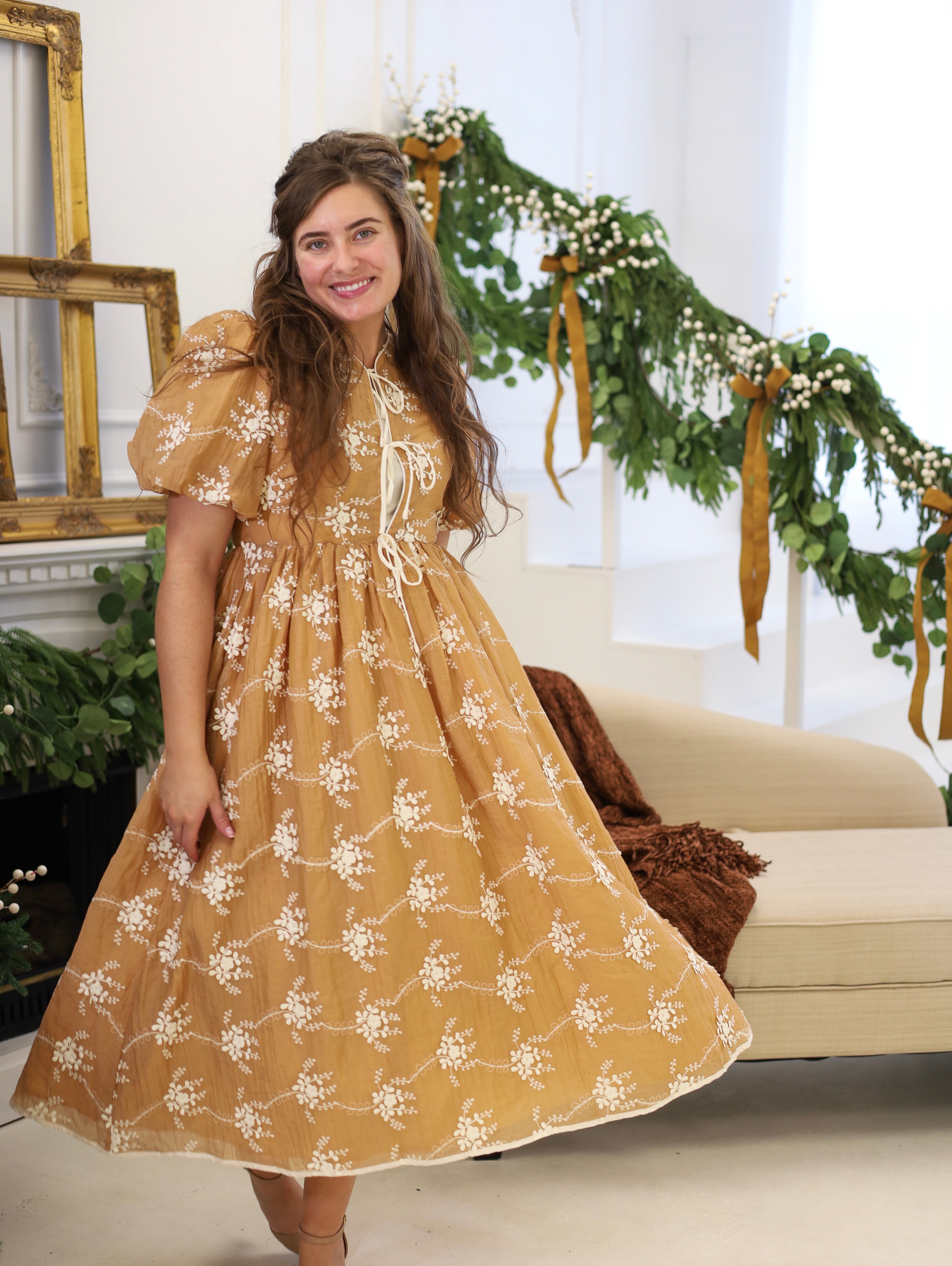 Description: Step into an effortlessly romantic look with this Cinnamon colored midi dress, adorned in delicate ivory floral embroidery. Featuring airy puff sleeves and a charming tiered tie-front bodice, this piece captures the essence of vintage countryside elegance with a modern fit. The lightweight, crinkled fabric adds texture and movement, perfect for warm days and dreamy getaways. Designed with a flowy silhouette and soft gathers at the waist, this dress offers both comfort and femininity. Whether you're strolling through a garden or heading to a farmer's market, this piece brings a graceful, laid-back feel to your look.