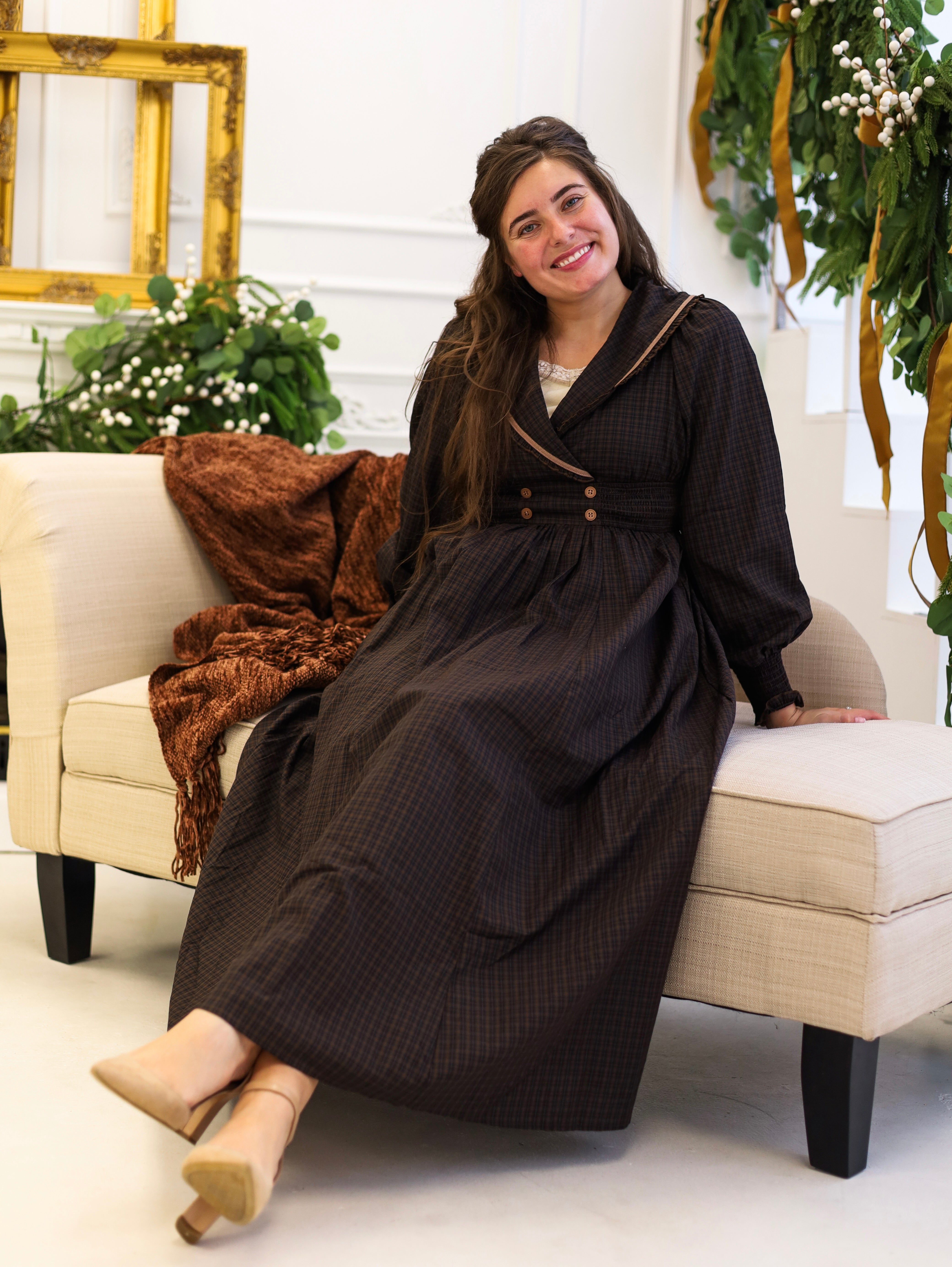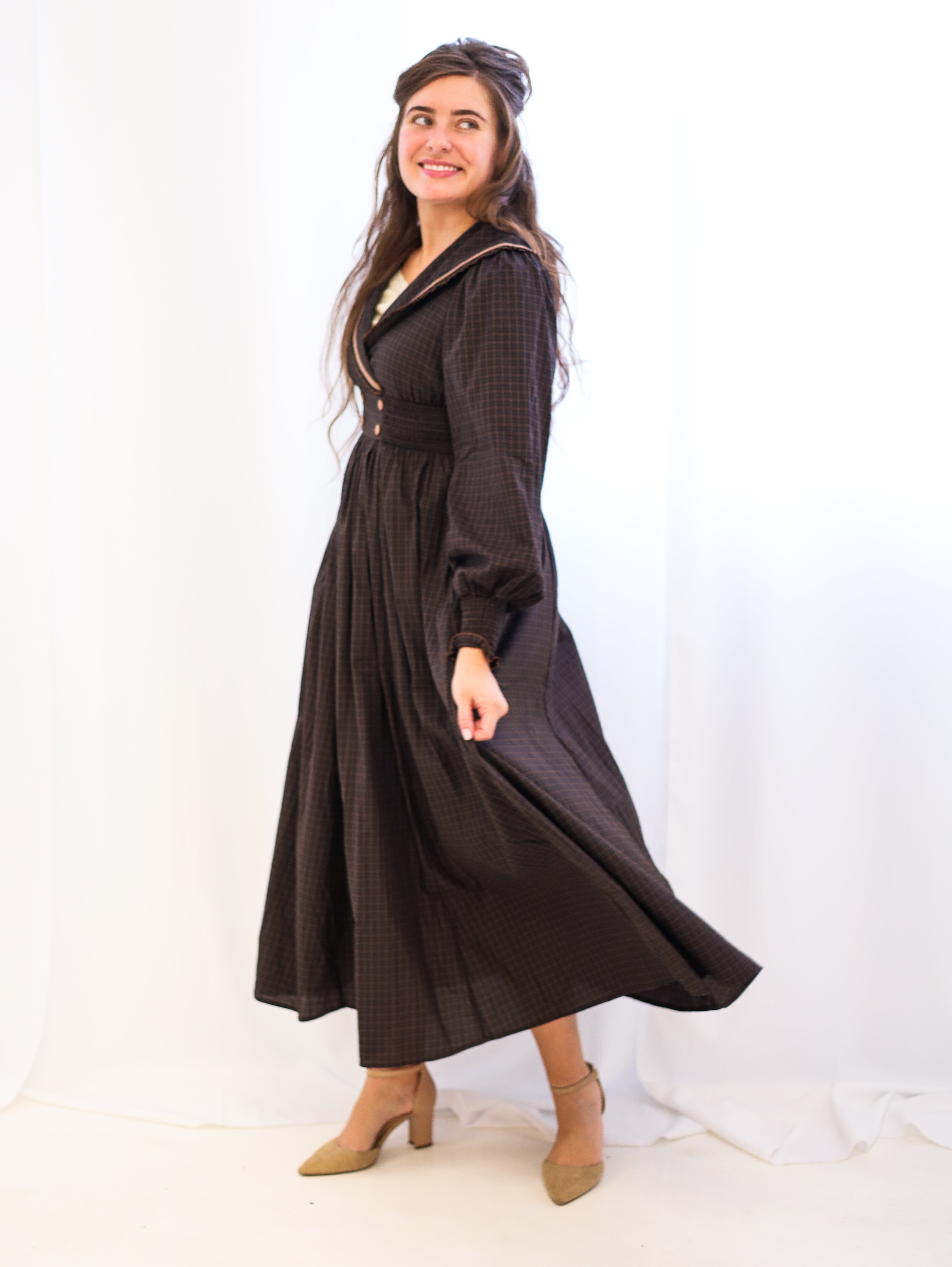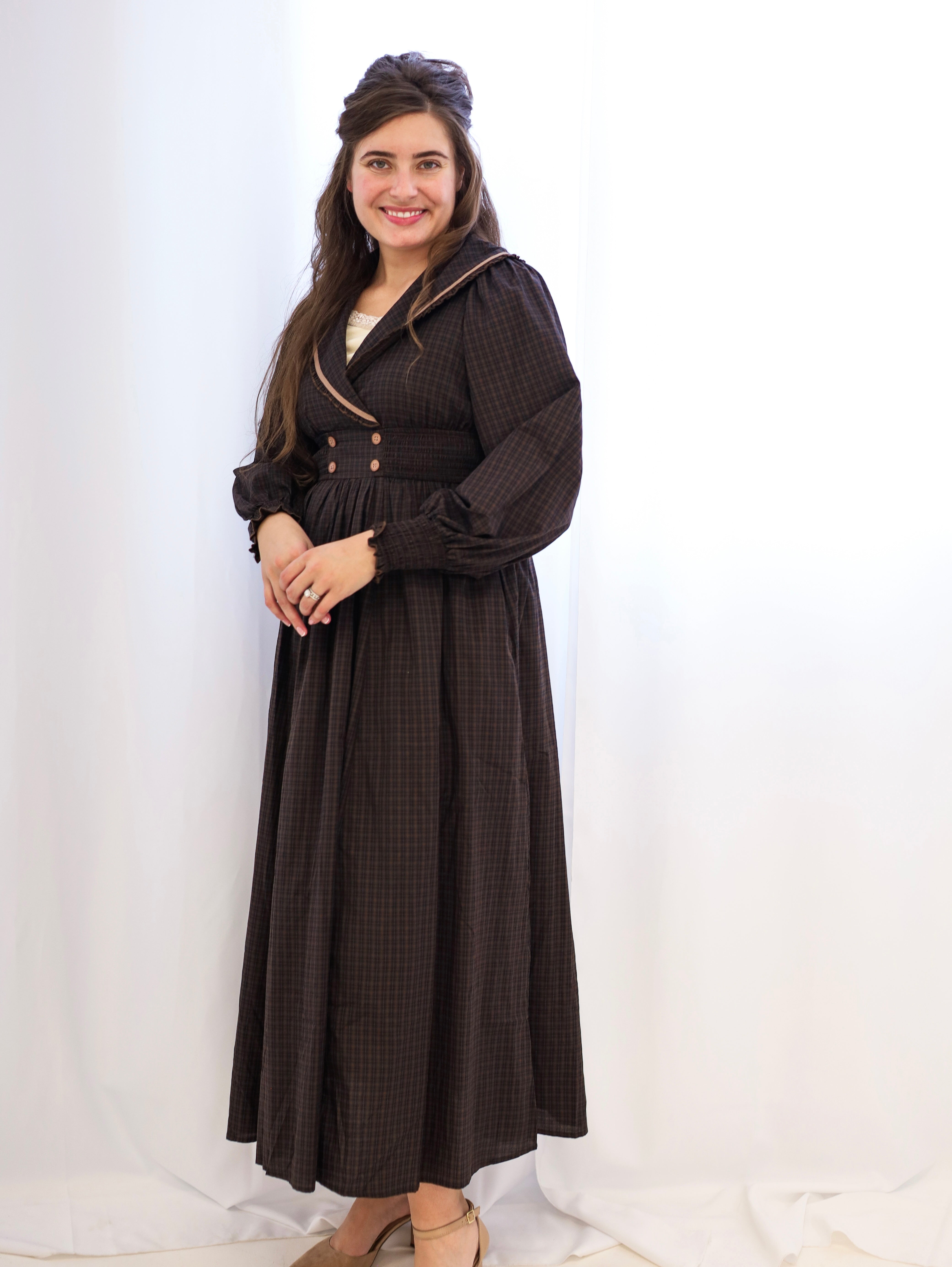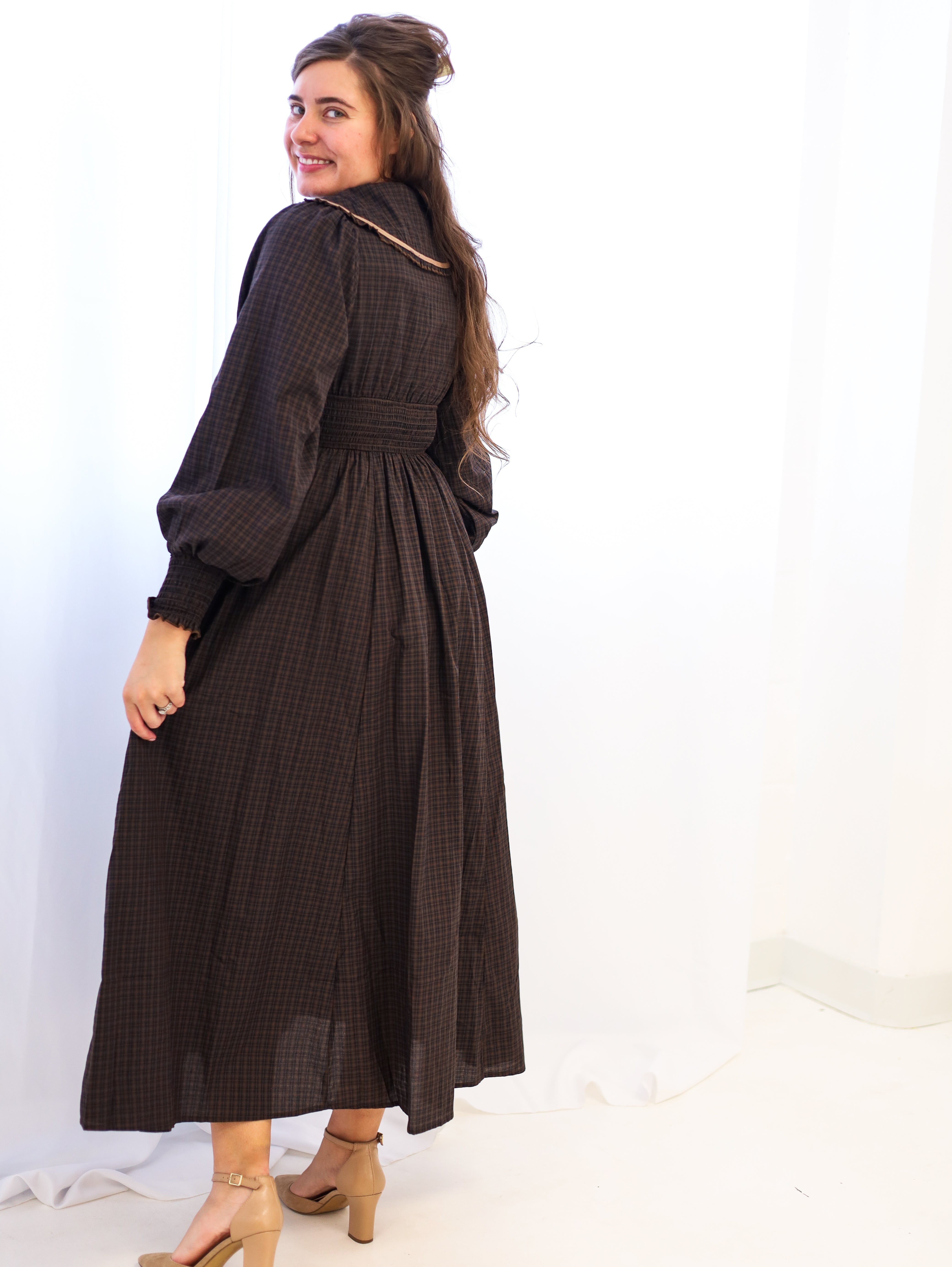 This sophisticated plaid maxi dress combines vintage charm with modern practicality. The statement collar and surplice neckline create an elegant silhouette, while smocked details at the waist and cuffs add refined texture and definition. Functional pockets and decorative buttons enhance both style and utility, and the full lining ensures comfort throughout the day. Long sleeves with smocked ends provide versatile layering options for any season. A timeless piece that transitions effortlessly from casual to dressy occasions.